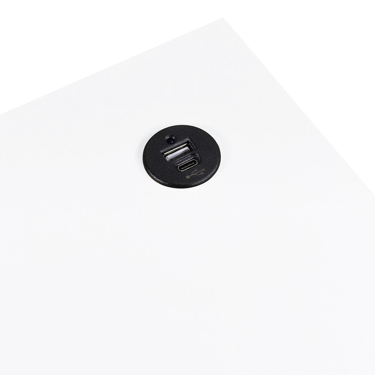 - La mesa más pequeña tiene ruedas y se coloca debajo de la más grande, que incluye un puerto USB en el tablero.
