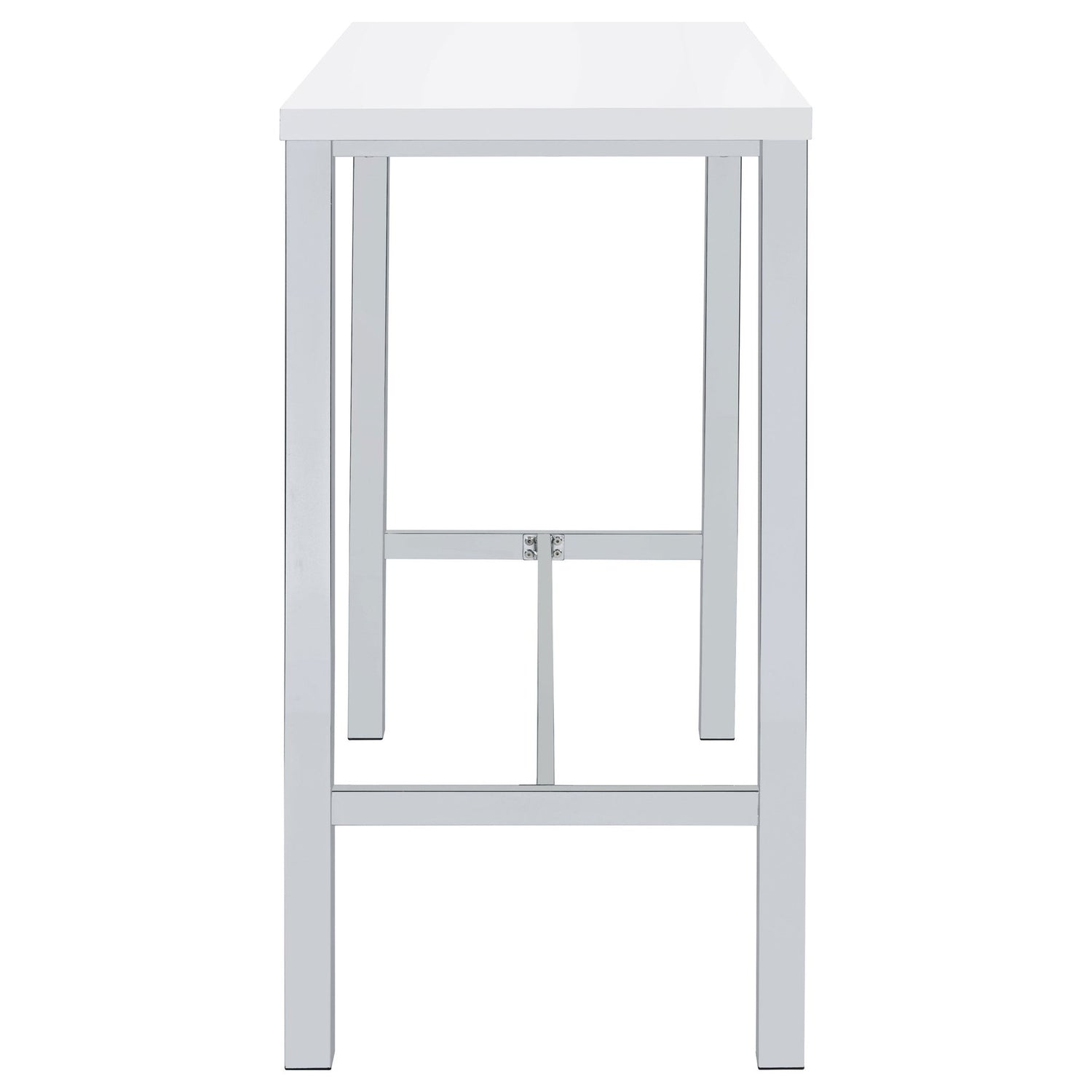 Ultramoderno y de líneas limpias, este juego de bar de cinco piezas incluye una mesa rectangular y cuatro taburetes. Ideal para un hogar contemporáneo, la mesa cuenta con elegantes patas cuadradas y una estructura de acero con acabado cromado pulido y galvanizado que aporta un toque lujoso a cualquier estancia. El tablero presenta un acabado lacado blanco de alto brillo y tiene capacidad para cuatro personas. Cada taburete también cuenta con un asiento y patas a juego en blanco brillante. Uno de los taburetes también cuenta con reposapiés para mayor soporte y estabilidad.