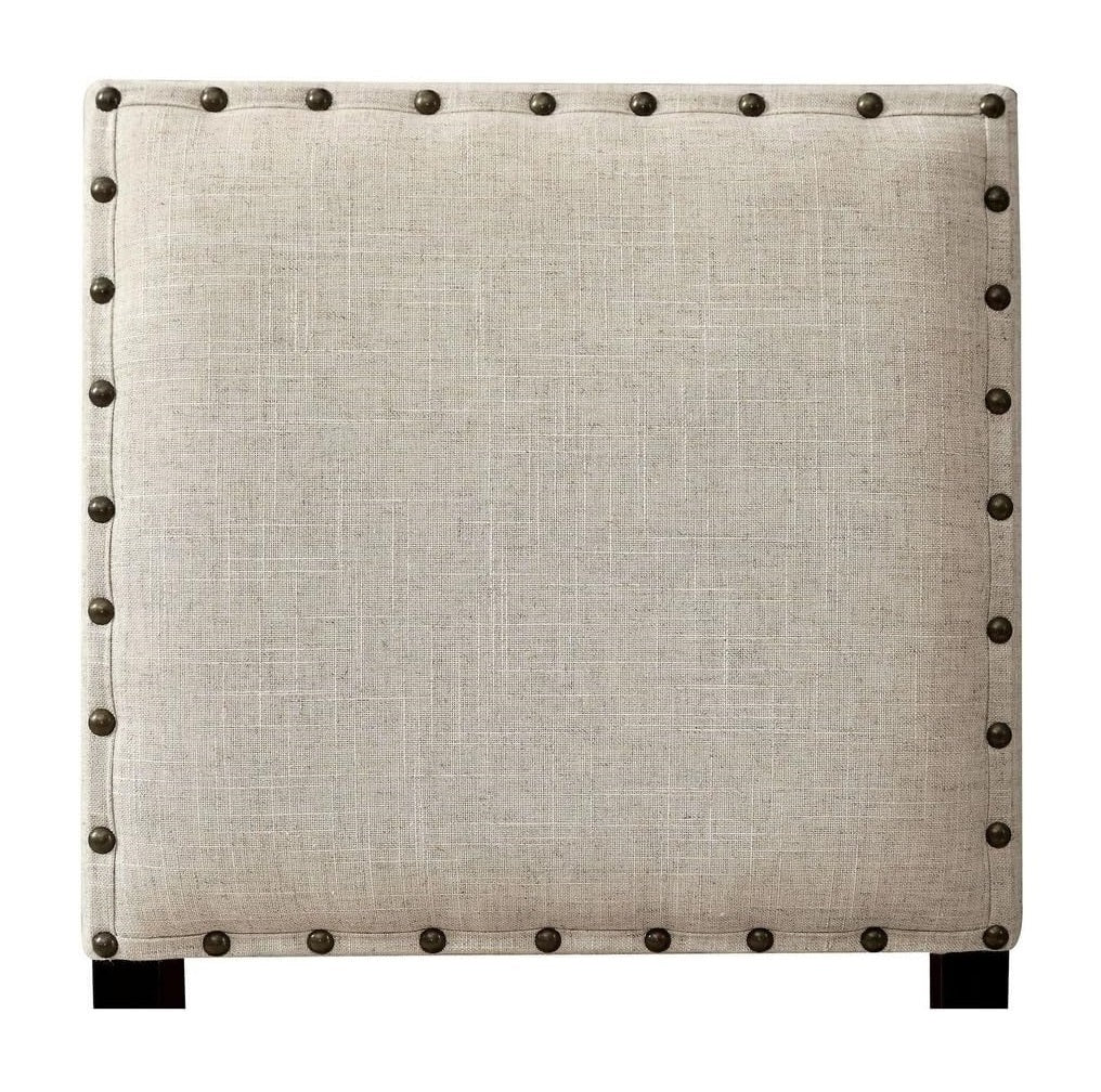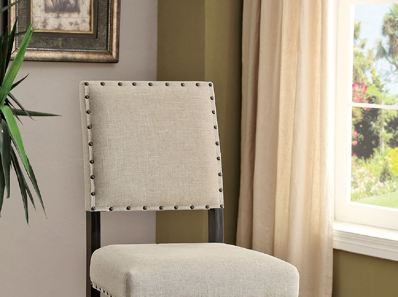 Juego de comedor alto de 5 piezas de madera negra antigua con mesa y 4 sillas, cojines de tela imitación lino color marfil y ribete de tachuelas. está agotado y se enviará tan pronto como vuelva a estar disponible.