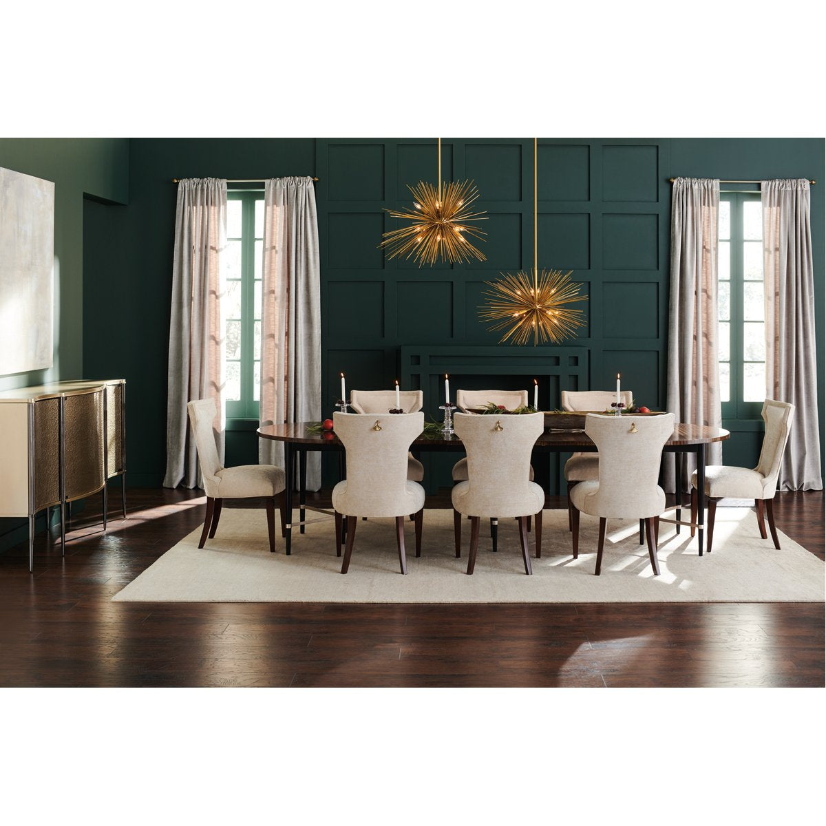 Para reuniones pequeñas o grandes, esta llamativa y llamativa mesa de comedor te cautivará. Su perfil tradicional contemporáneo está diseñado para grupos de cuatro a doce personas. La impresionante madera Paldao cuarteada distingue el tablero y está acabada en un rico tono Saddle, mientras que un profundo acabado Saddle Black añade profundidad a las patas y el faldón. Un acabado Neutral Metallic realza sus bastidores para un toque de glamour. A medida que crece tu grupo, esta impresionante mesa puede extenderse hasta 365 cm con la adición de cuatro hojas de 61 cm.
