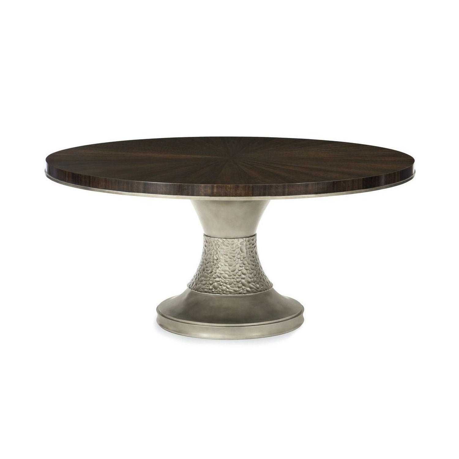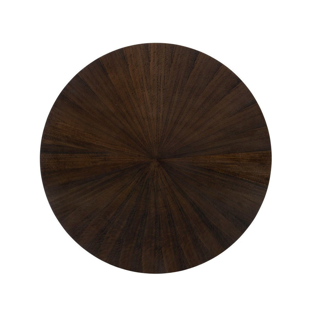- El tablero de la mesa tiene un patrón de chapa a juego radial en Bourbon envejecido con moldura de borde de bronce ahumado alrededor de la parte inferior del faldón.