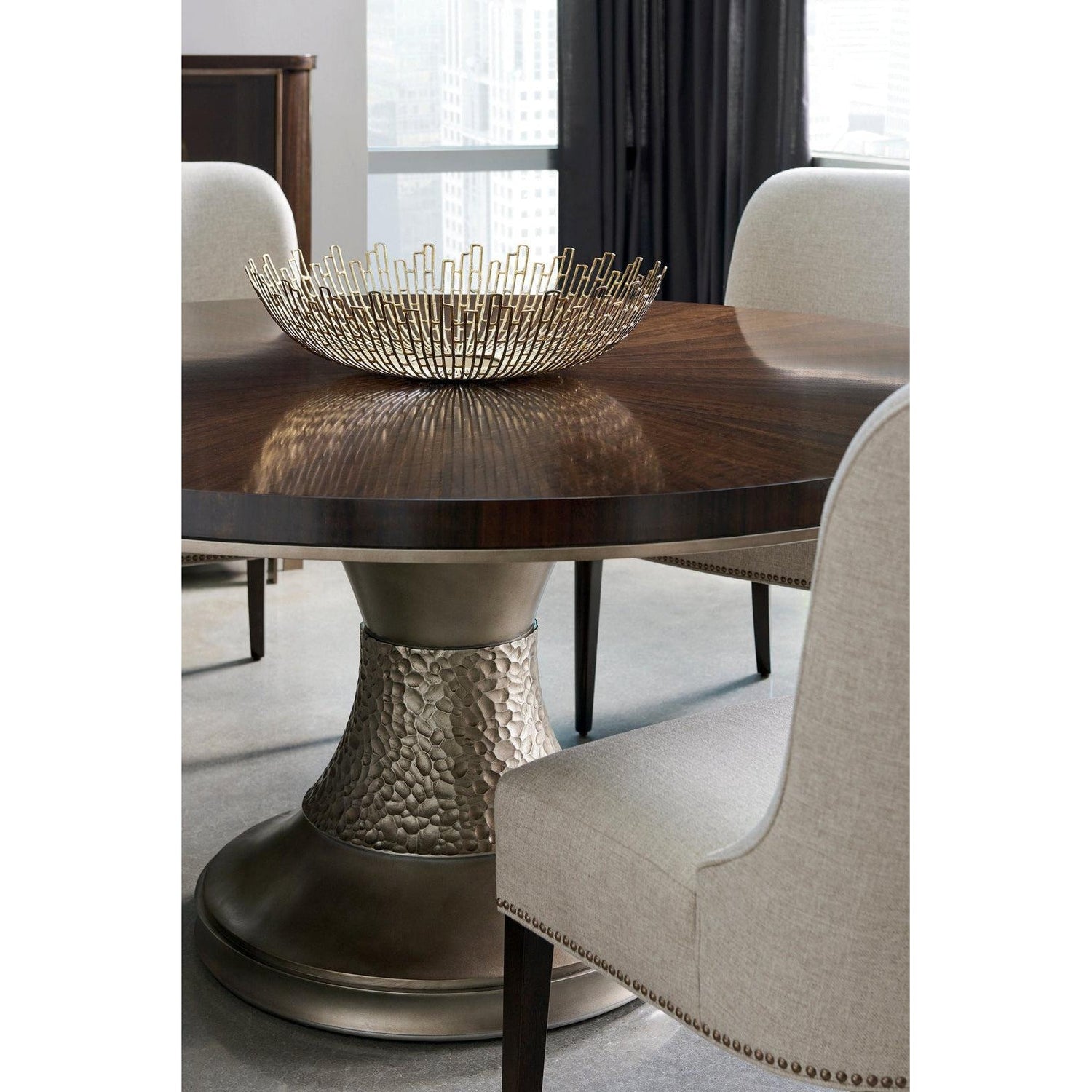 - La mirada se dirige inmediatamente a la base de bronce ahumado granulado que es una obra de arte en sí misma.