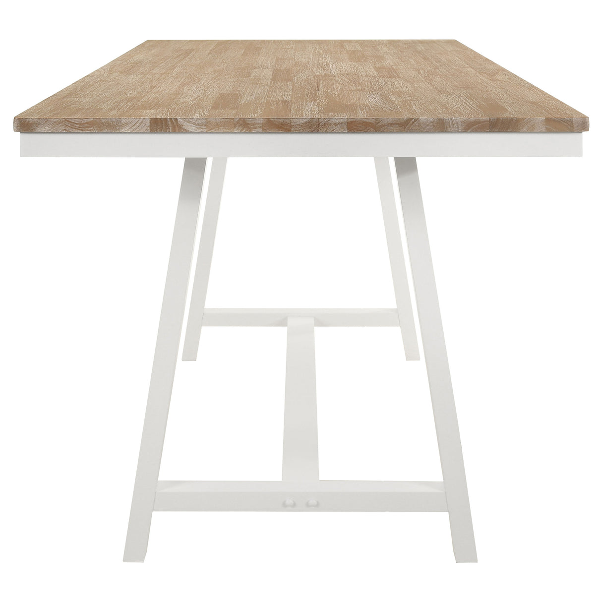 - El diseño de mesa de dos tonos presenta una base blanca nítida y un tablero de madera marrón cepillado con alambre.