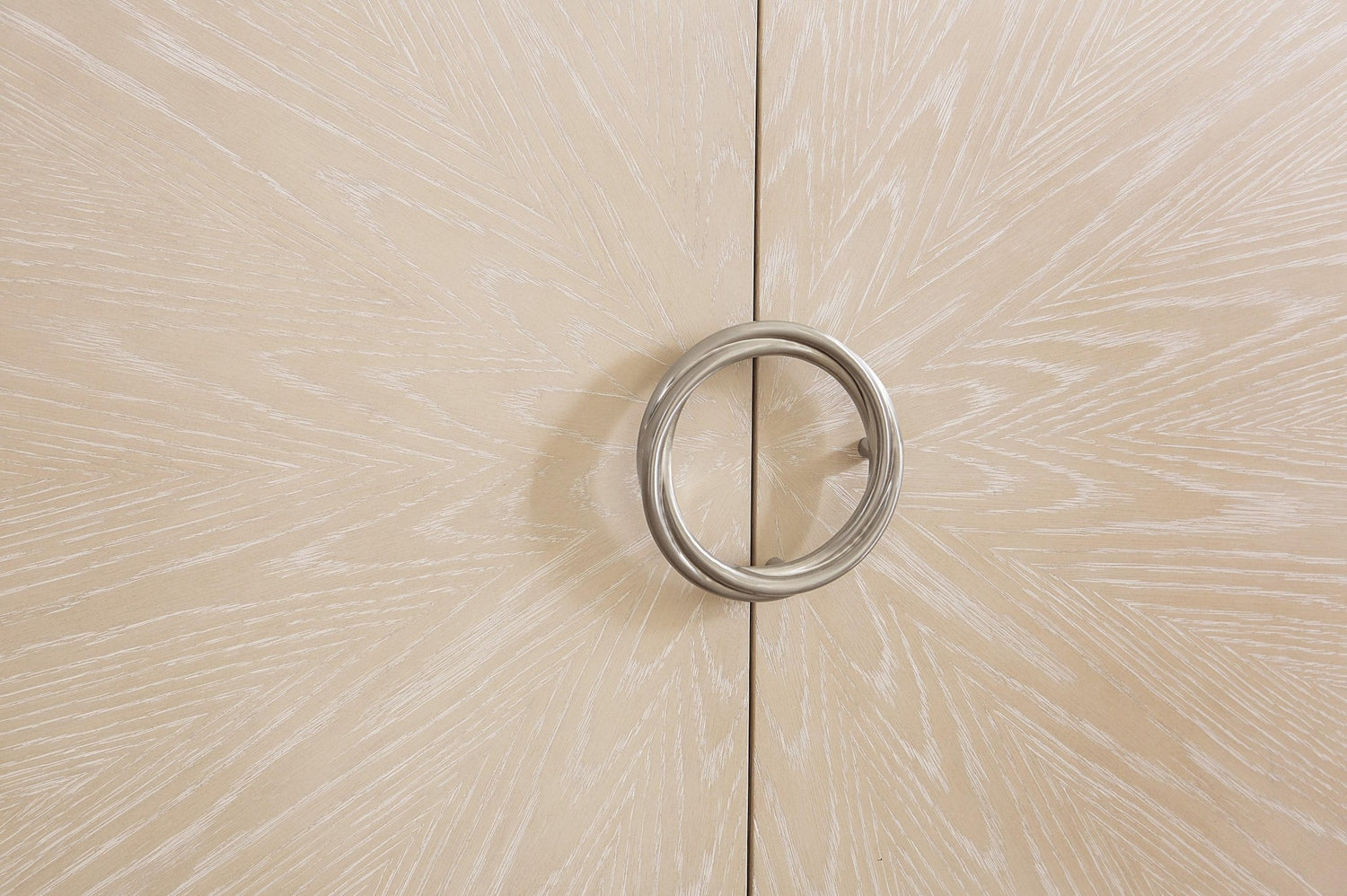 Los tiradores giratorios con acabado en níquel redondeado y las líneas curvas fluidas le dan a esta pieza su atractivo moderno y de transición característico, perfecto para espacios de comedor informales elevados o entradas refinadas.