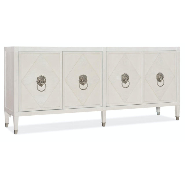 Añada un toque de elegancia y sofisticación clásica con el aparador de cuatro puertas Melange Leo de Hooker Furniture . Diseñada para destacar, esta impresionante pieza luce un suave acabado exterior en blanco crema, virolas de metal plateado y elegantes herrajes con forma de cabeza de león. Abra las puertas para descubrir un interior en un audaz azul Tiffany : una sofisticada sorpresa que aporta profundidad y estilo.