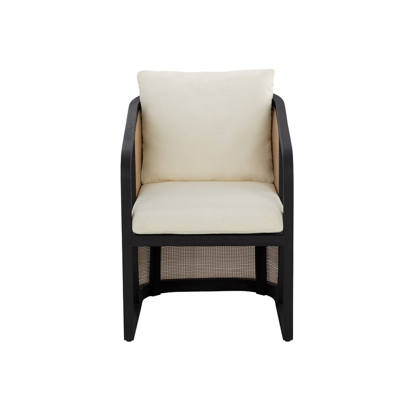 La llamativa silueta curva de la silla de comedor Palermo sin duda será un complemento atractivo para cualquier espacio exterior. Su respaldo de barril presenta un contraste de materiales y colores con una combinación de tejido de mimbre de caña y madera de teca color carbón. Su cómodo acolchado está tapizado en nuestra tela Stinson color crema, con brazos inclinados que le dan un aspecto flotante. La madera de teca adquiere un acabado gris plateado con el tiempo.