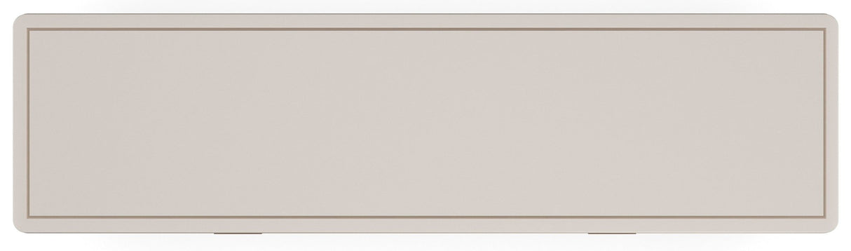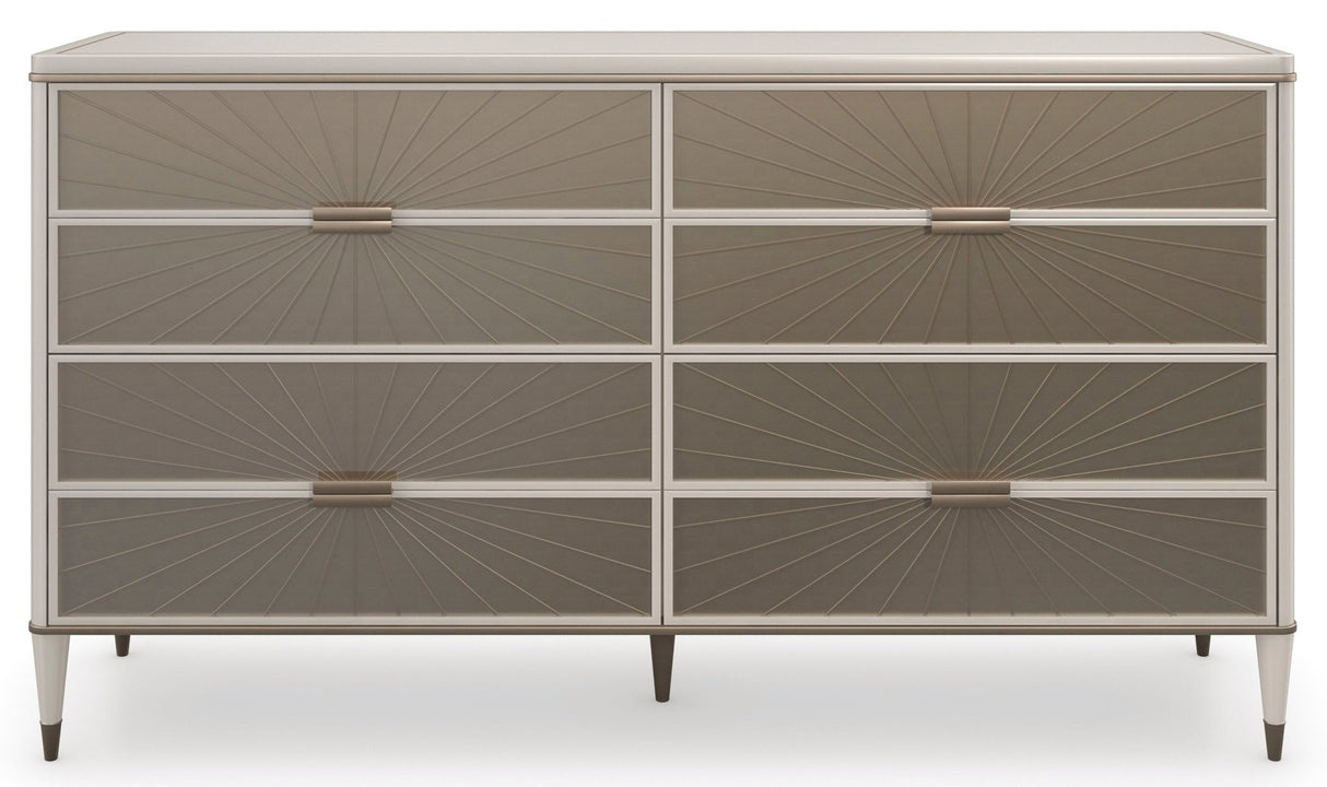 - Ocho cajones con frentes en vidrio pintado al ácido en la parte posterior en Golden Shimmer con patrón de corte en V y guías laterales de cierre suave.