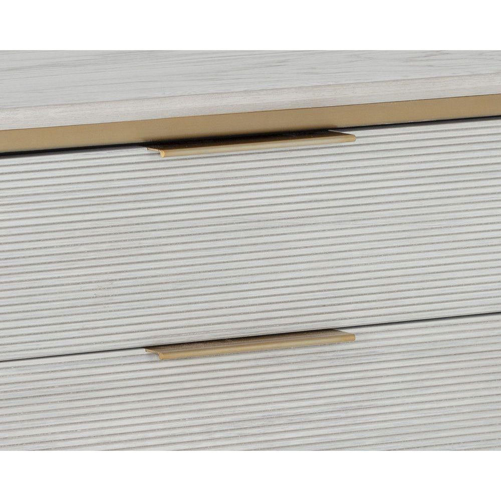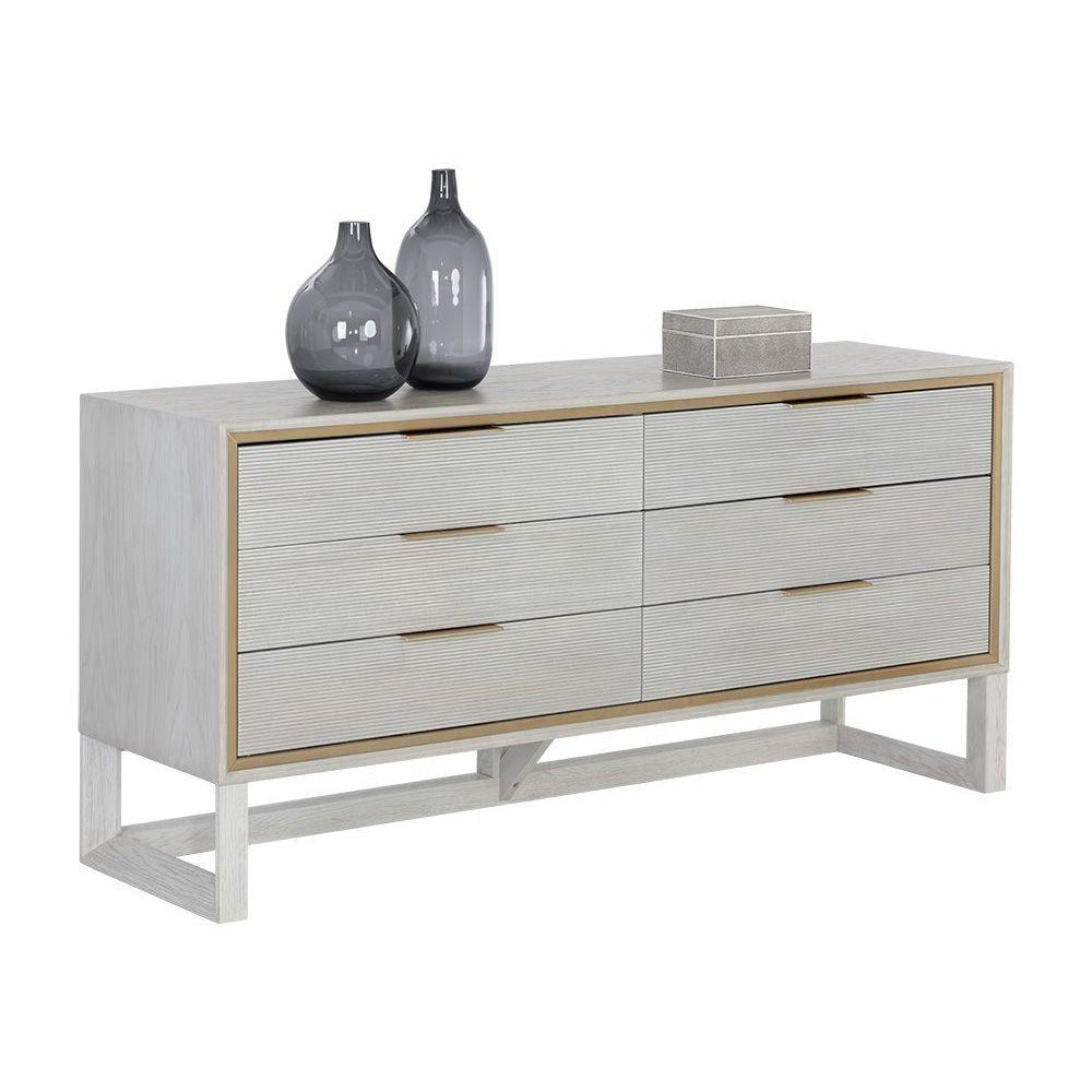 Respira un aire de romance rústico con esta hermosa cómoda, elaborada en Vietnam. Este diseño cuenta con seis cajones estriados de madera maciza de roble con un acabado gris perla. Los herrajes de hierro dorado completan el estilo. Combina con la cama y la mesita de noche a juego.