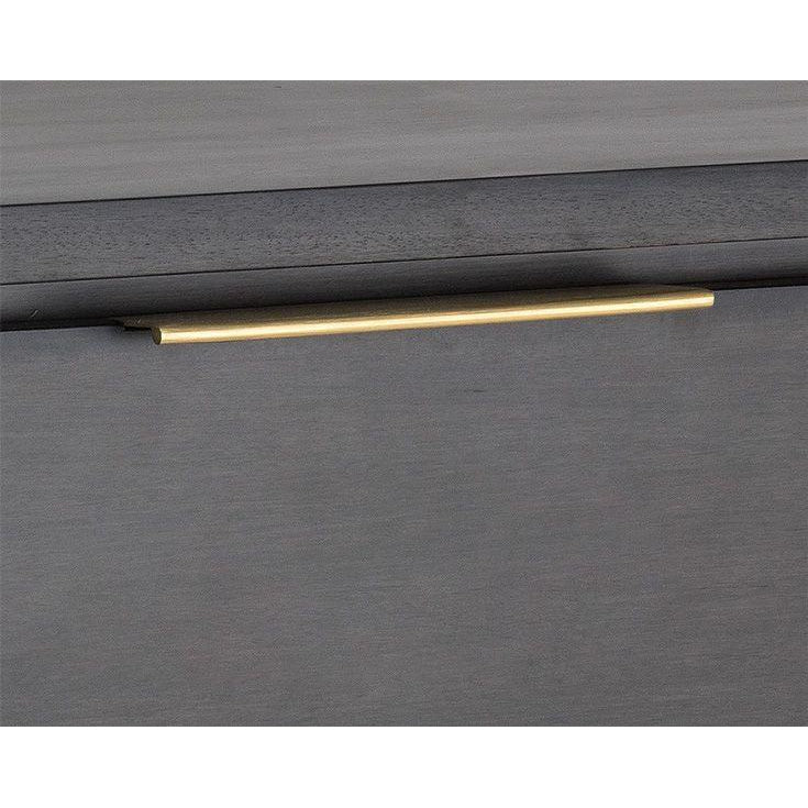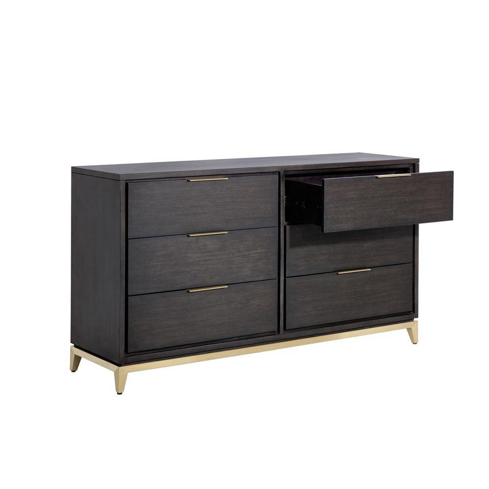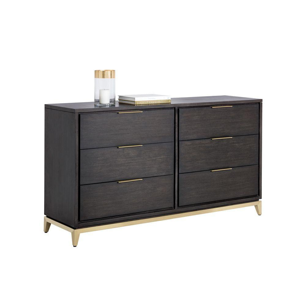 Esta cómoda de nuestra colección Irongate aportará calidez y encanto a cualquier dormitorio. Fabricada en chapa de madera de acacia con un acabado marrón grisáceo ahumado, cuenta con seis cajones profundos de cierre suave. Los tiradores y la base de acero cepillado en oro amarillo completan el diseño.