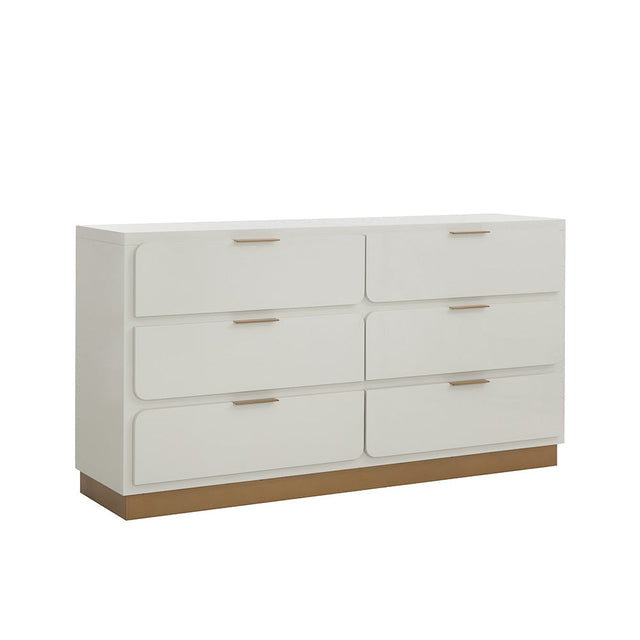Cree un dormitorio lujoso y atractivo con esta cómoda contemporánea de elegante diseño minimalista. Fabricada en madera maciza de álamo y disponible en acabados lacados en crema y gris de alto brillo. Cuenta con seis cajones y herrajes de acero color bronce rústico. También disponible con mesita de noche a juego.