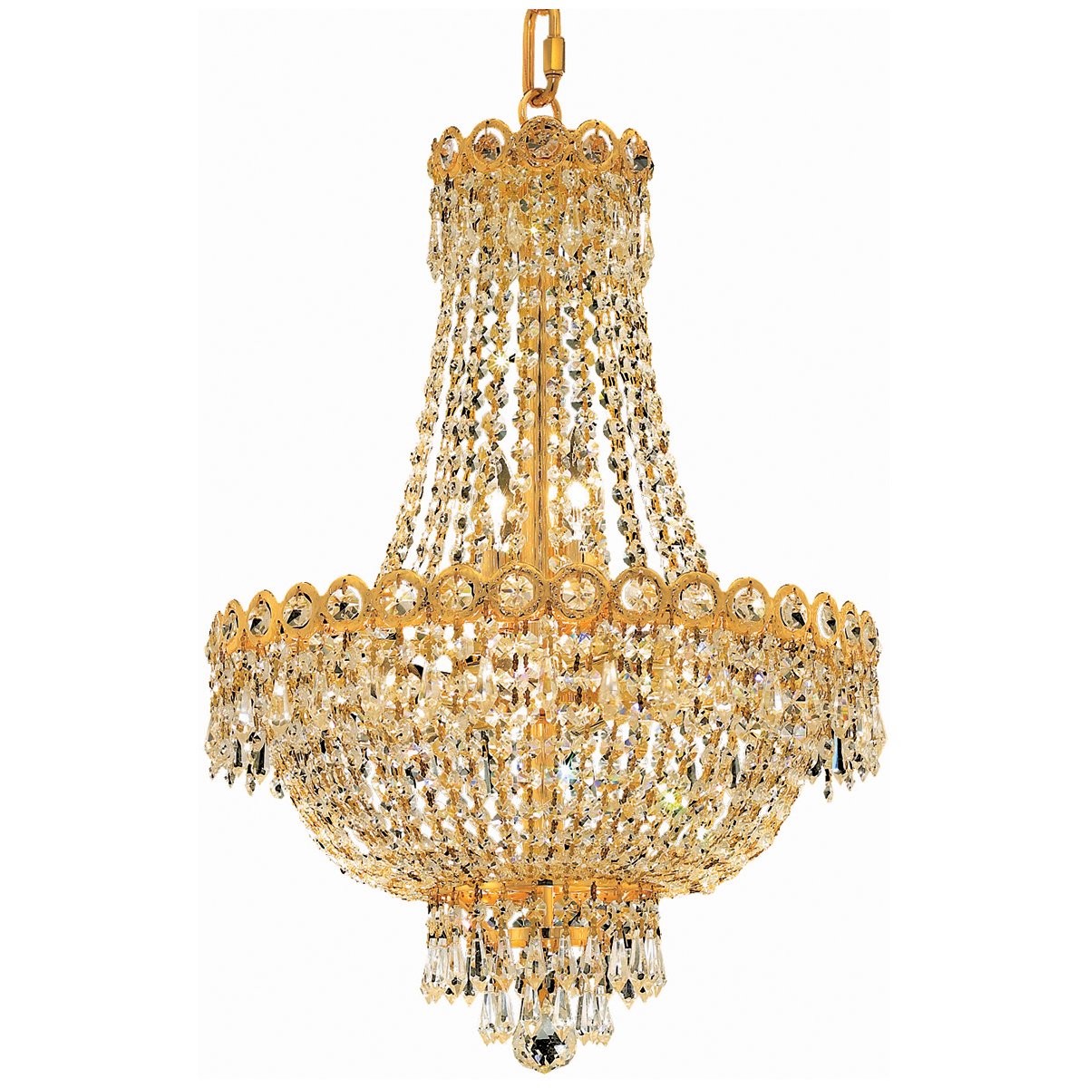 - Delicadas líneas de cristales que refractan la luz fluyen suavemente hacia abajo en forma de campana, rodeadas por aún más cristales transparentes de corte real.