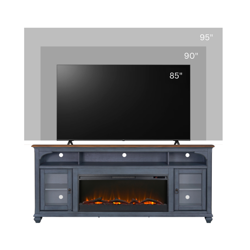 Soporte de TV con chimenea de 86 pulgadas para televisores de hasta 95 pulgadas, acabado azul pana