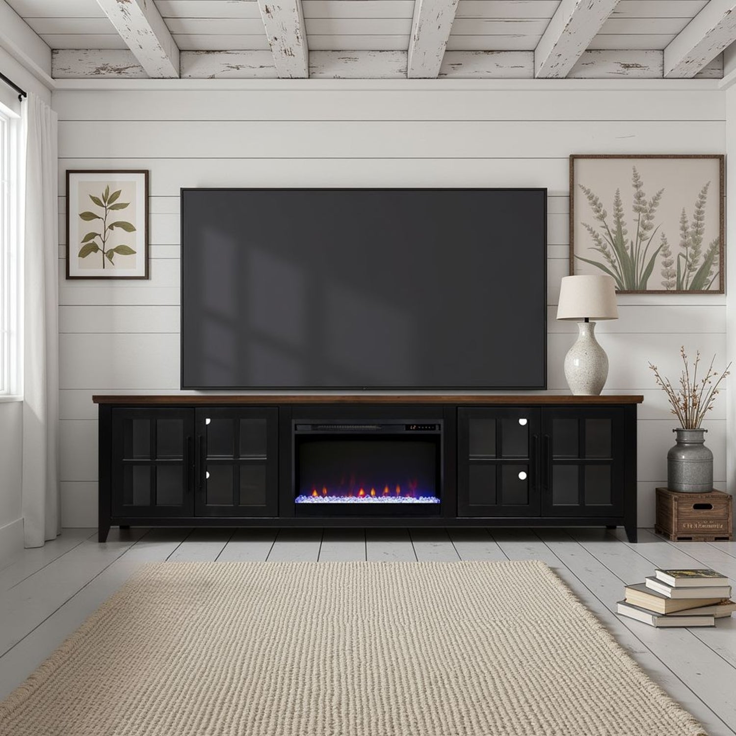 Soporte para TV con chimenea Providence de 96 pulgadas, para televisores de hasta 100 pulgadas, requiere un ensamblaje mínimo, acabado en negro y bourbon - Por defecto está agotado y se enviará tan pronto como vuelva a estar disponible.