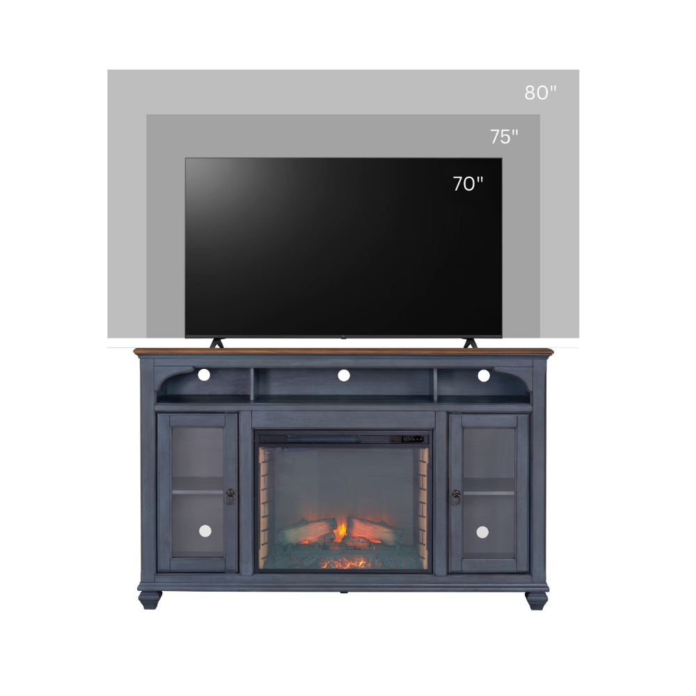 Soporte de TV con chimenea de 66 pulgadas para televisores de hasta 80 pulgadas, acabado azul pana
