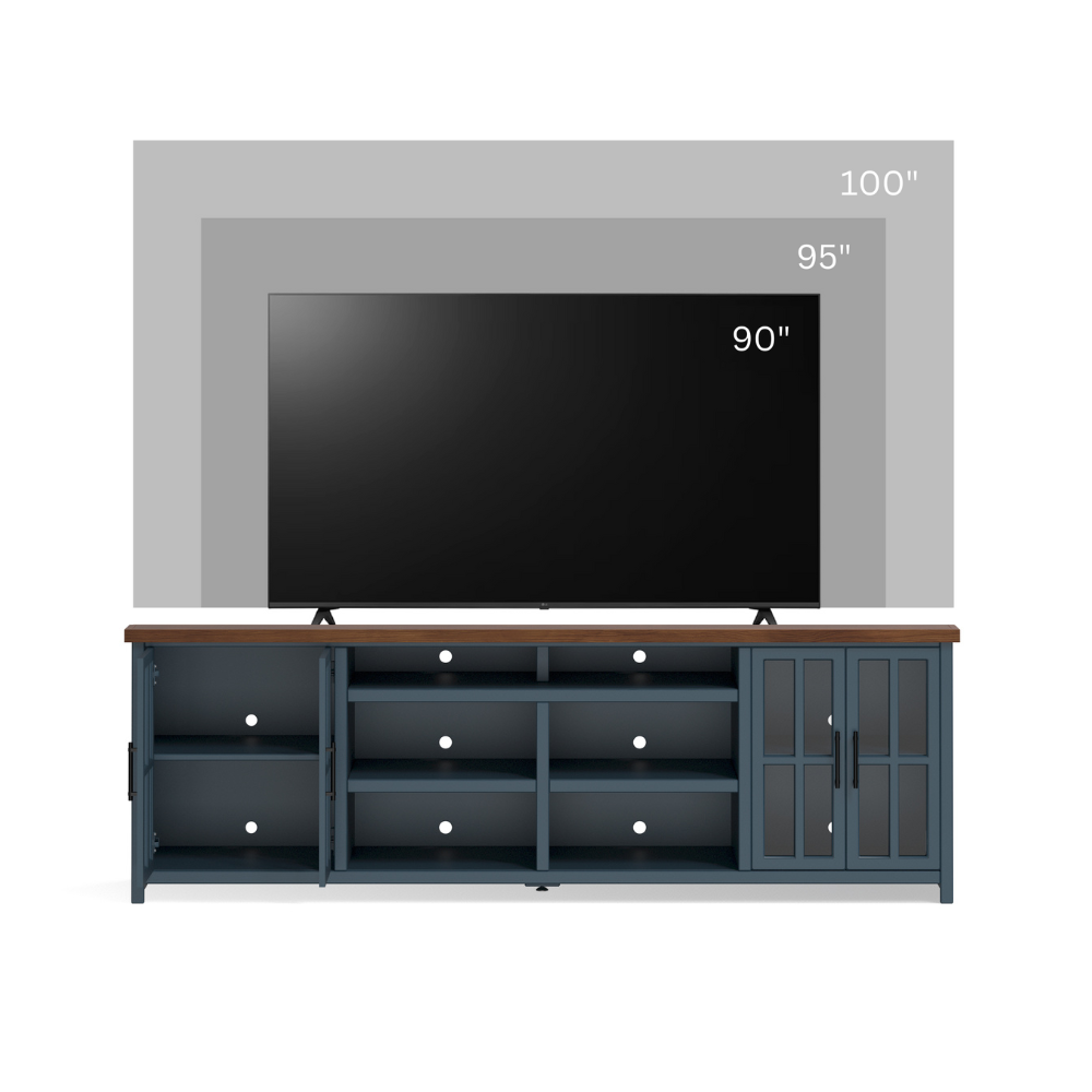 Consola de TV de 96 pulgadas para televisores de hasta 100 pulgadas, no requiere ensamblaje, acabado en azul denim y whisky
