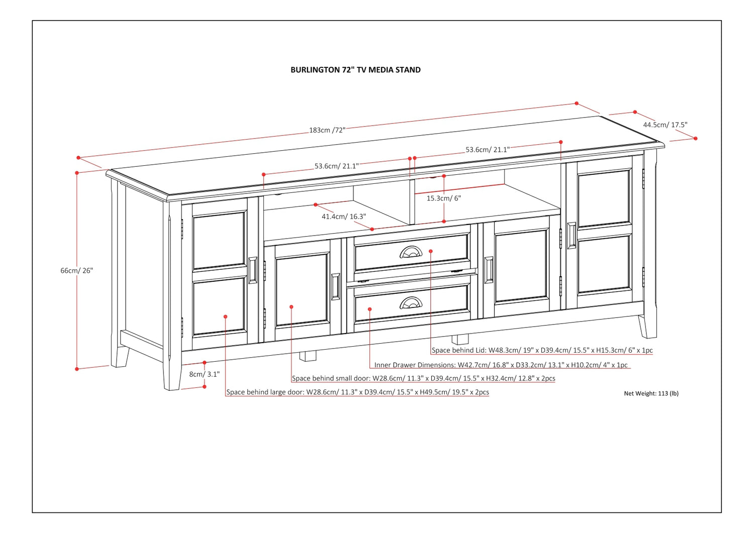 - Dimensiones: 17,5' D x 72' W x 26' H – Un soporte multimedia de tamaño generoso que admite televisores de hasta 80 pulgadas, ideal para grandes configuraciones de entretenimiento en salas de estar, estudios o espacios multiusos.