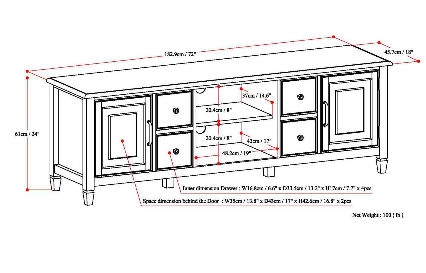 - Dimensiones: 18' D x 72' W x 24' H – Un soporte de TV ancho y de perfil bajo diseñado para televisores de hasta 80 pulgadas, que ofrece una superficie generosa y amplio espacio de almacenamiento y se adapta cómodamente a salas de estar o estudios.