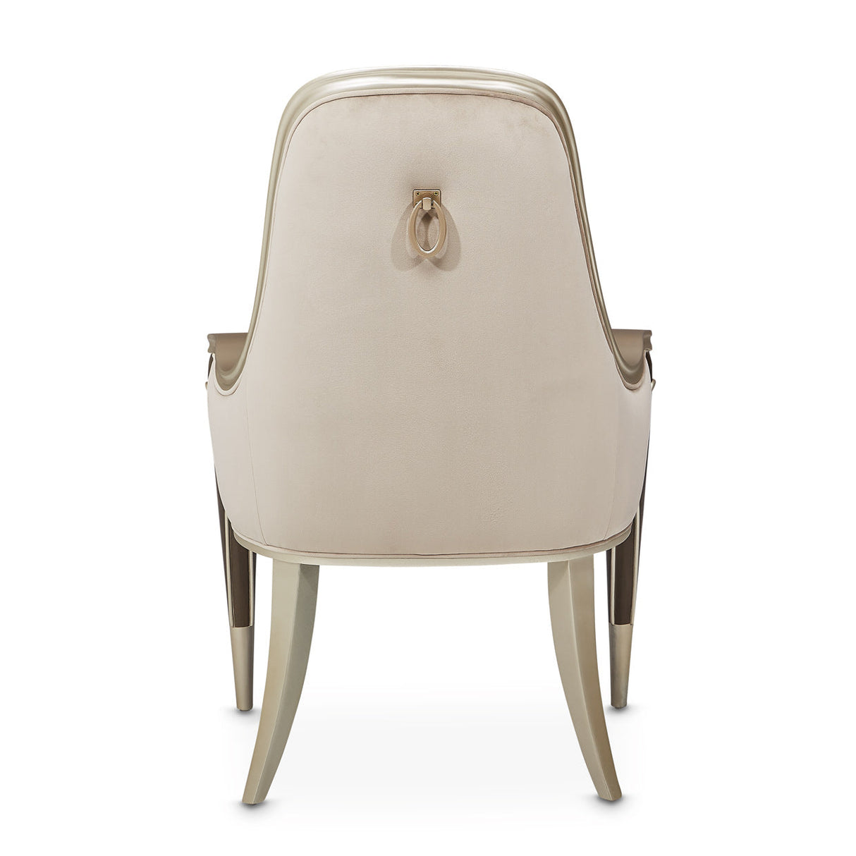 El juego de comedor Villa Cherie de 9 piezas de AICO Furniture combina un glamour moderno con cálidos tonos avellana . La mesa de comedor ovalada extensible (80"-124") luce una superficie de caoba con remolinos preteñidos, detalles en el tablero pintados en platino y un pedestal escultural en forma de trébol con motivos de cuerdas cruzadas en Chardonnay. Combina con seis sillas auxiliares y dos sillones para crear un comedor elegante y coordinado.