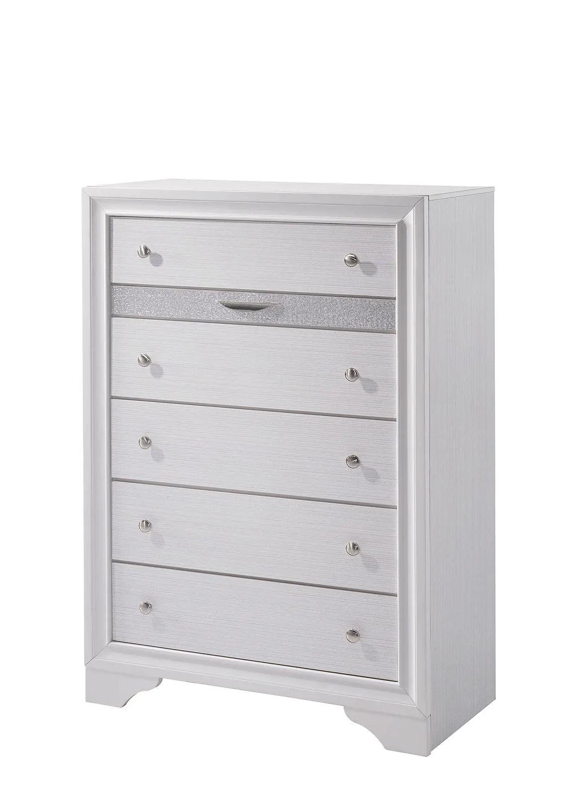 Cómoda Chrissy White, 87 cm de ancho x 42 cm de profundidad x 130 cm de alto, 61 kg. Ilumine su habitación con el brillo y el brillo que ofrece esta cómoda. Los relucientes acabados blancos promueven una estética refrescante y limpia con líneas plateadas que brillan con cualquier luz. Los tiradores plateados la detallan con un brillo radiante. Brillante y glamurosa, ¡crea la habitación que siempre has soñado! Características: Estilo contemporáneo, cajones para joyas empotrados, detalles plateados, madera maciza, chapa de madera, otros acabados en blanco.