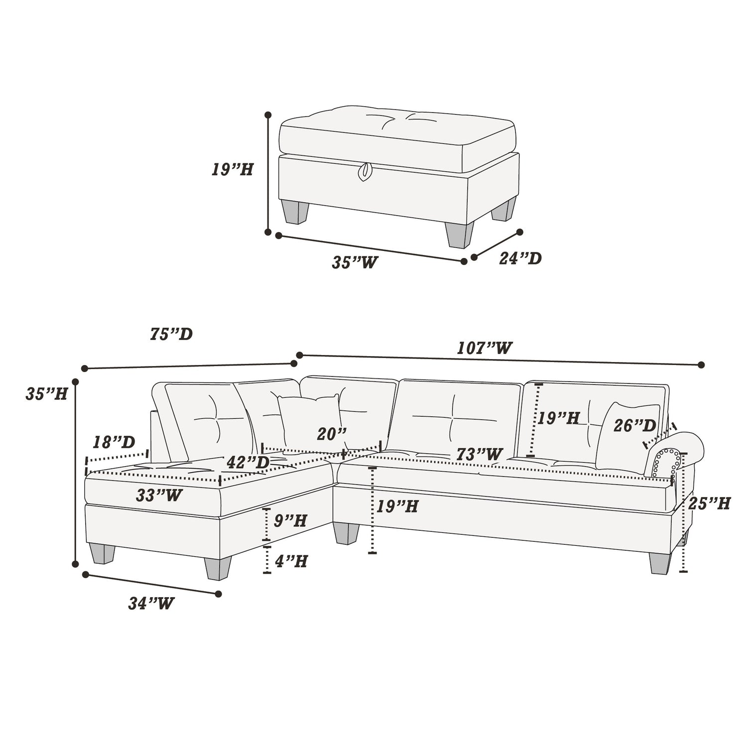 Listing Includes - 3pc Sectional Sofa Set (Sofa, Reversible Chaise L/R And Storage Ottoman) Only.