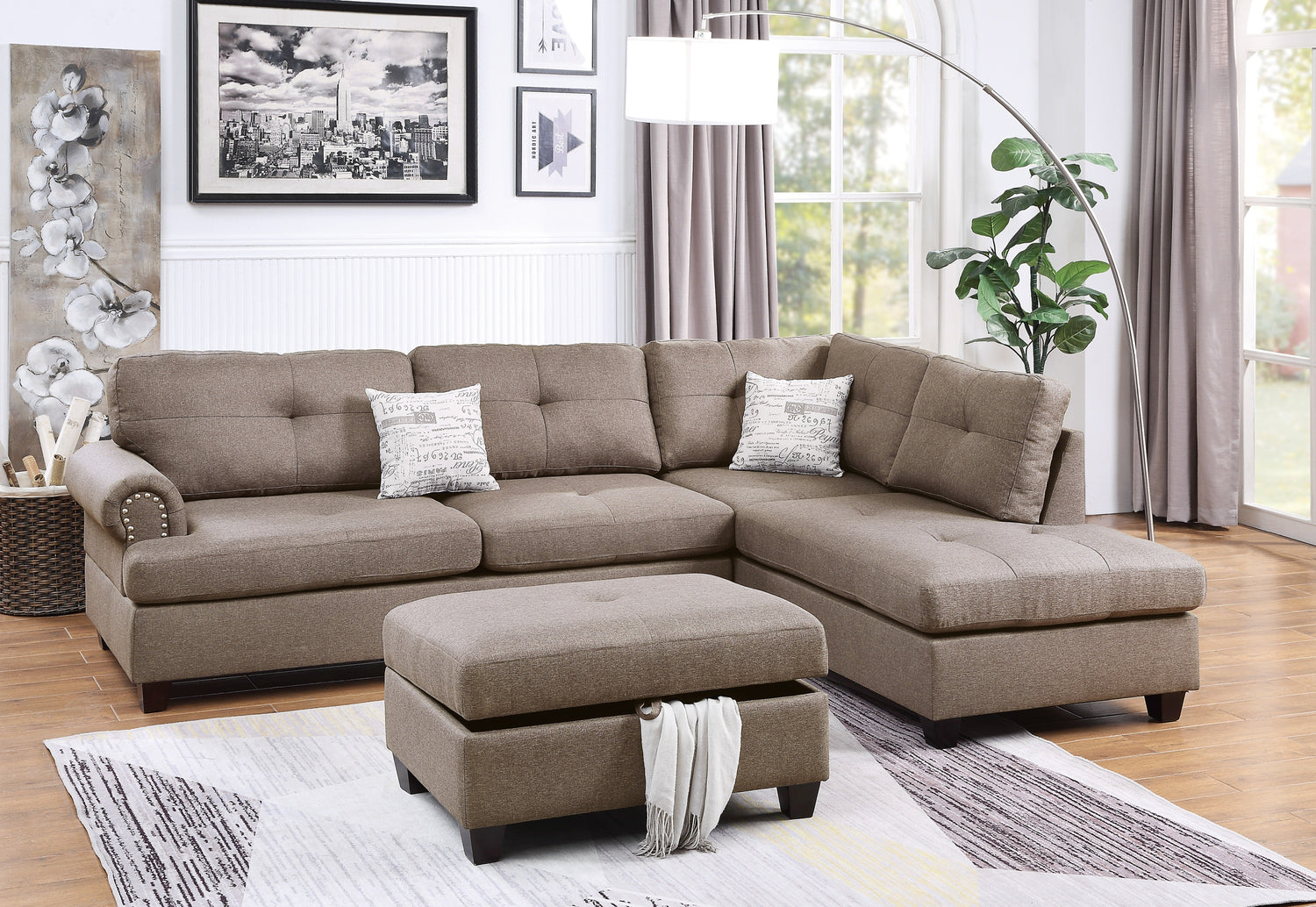 Contemporary 3-pcs Sectional Sofa Mocha Dorris Fabric Cushion Sofa Chaise Ottoman Reversible Couch Pillows