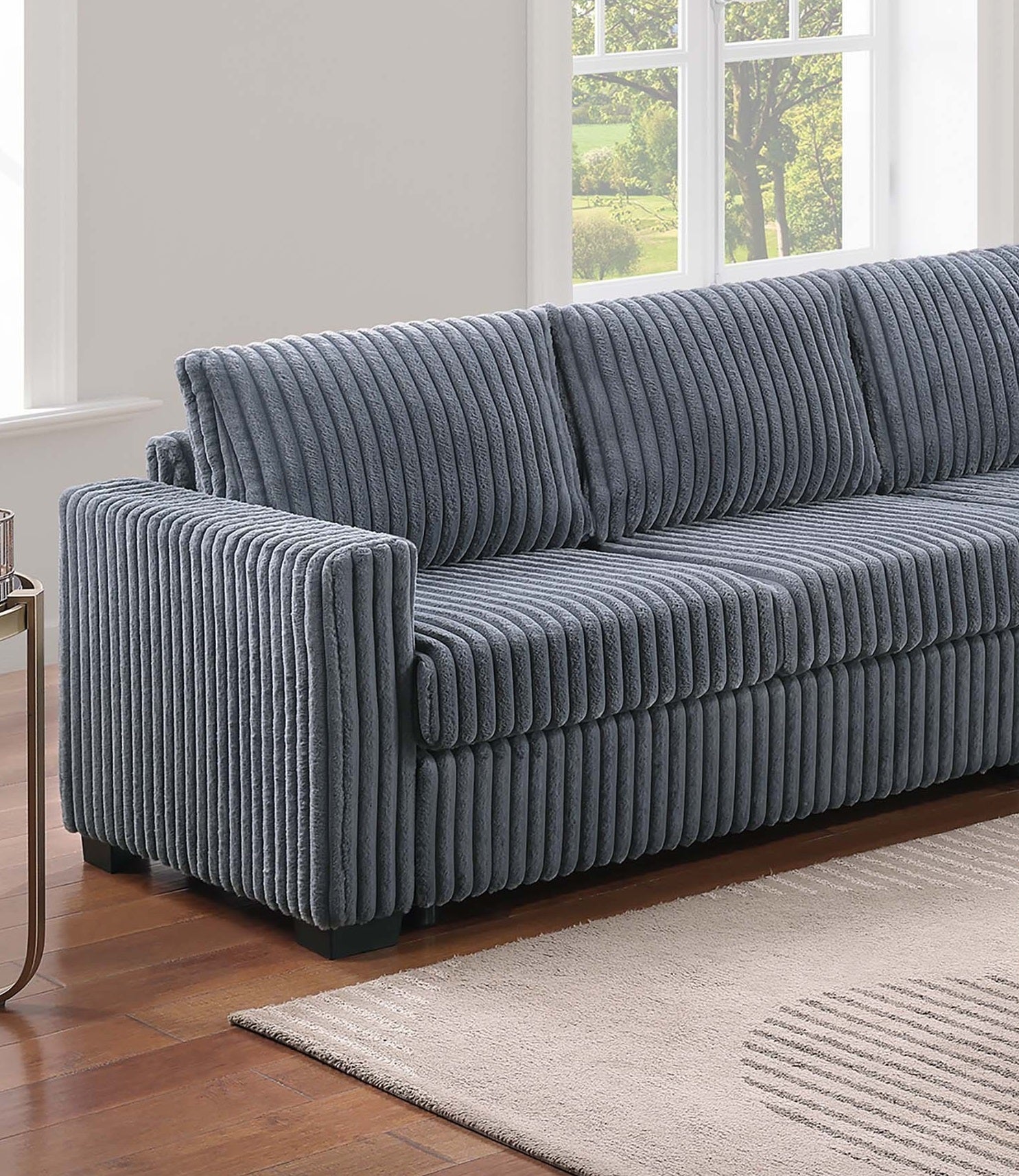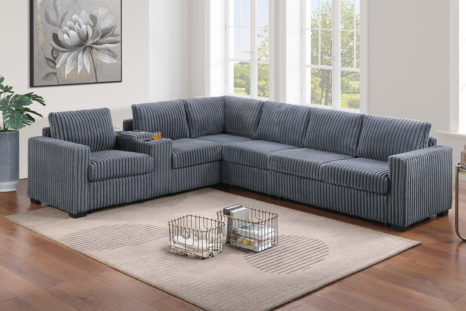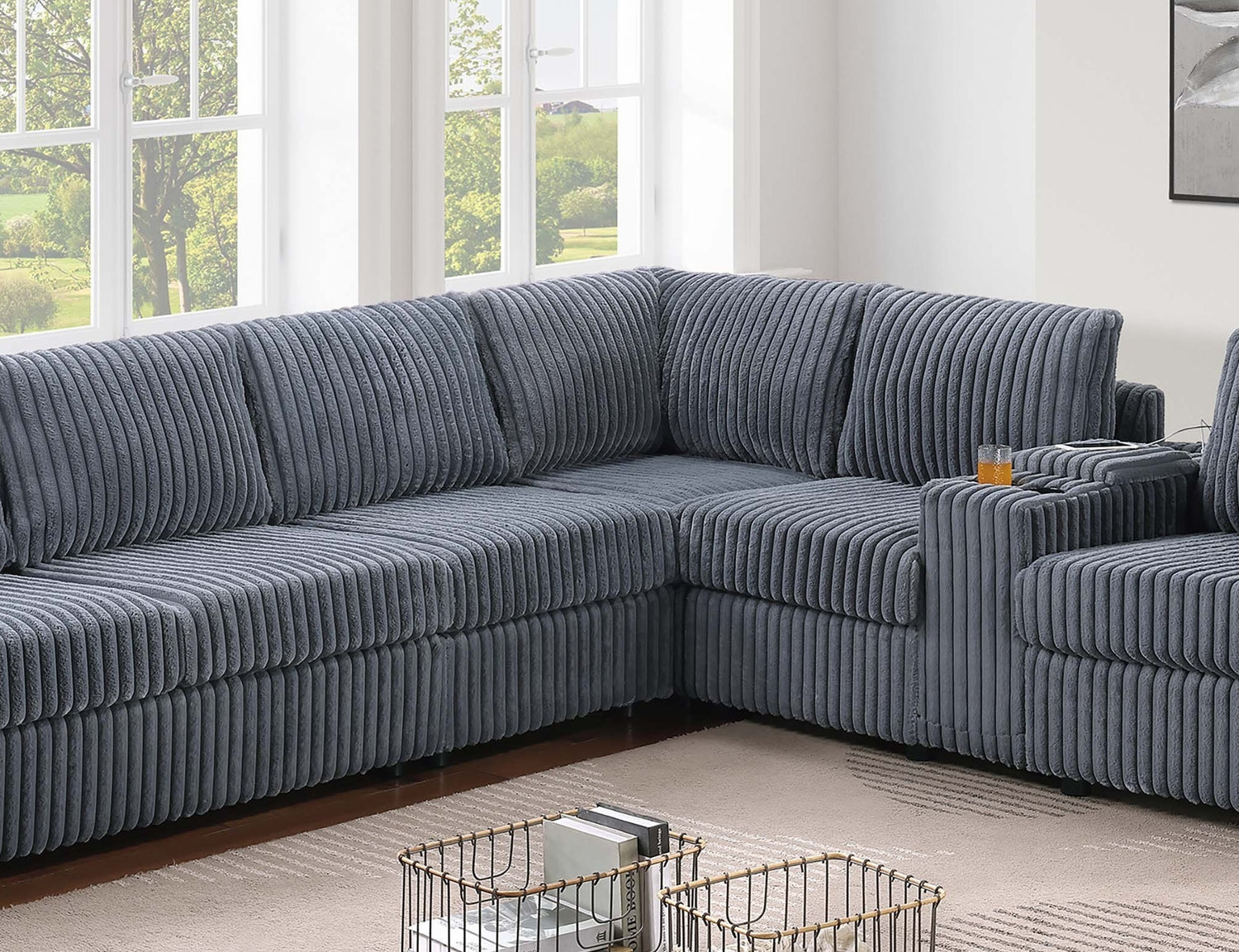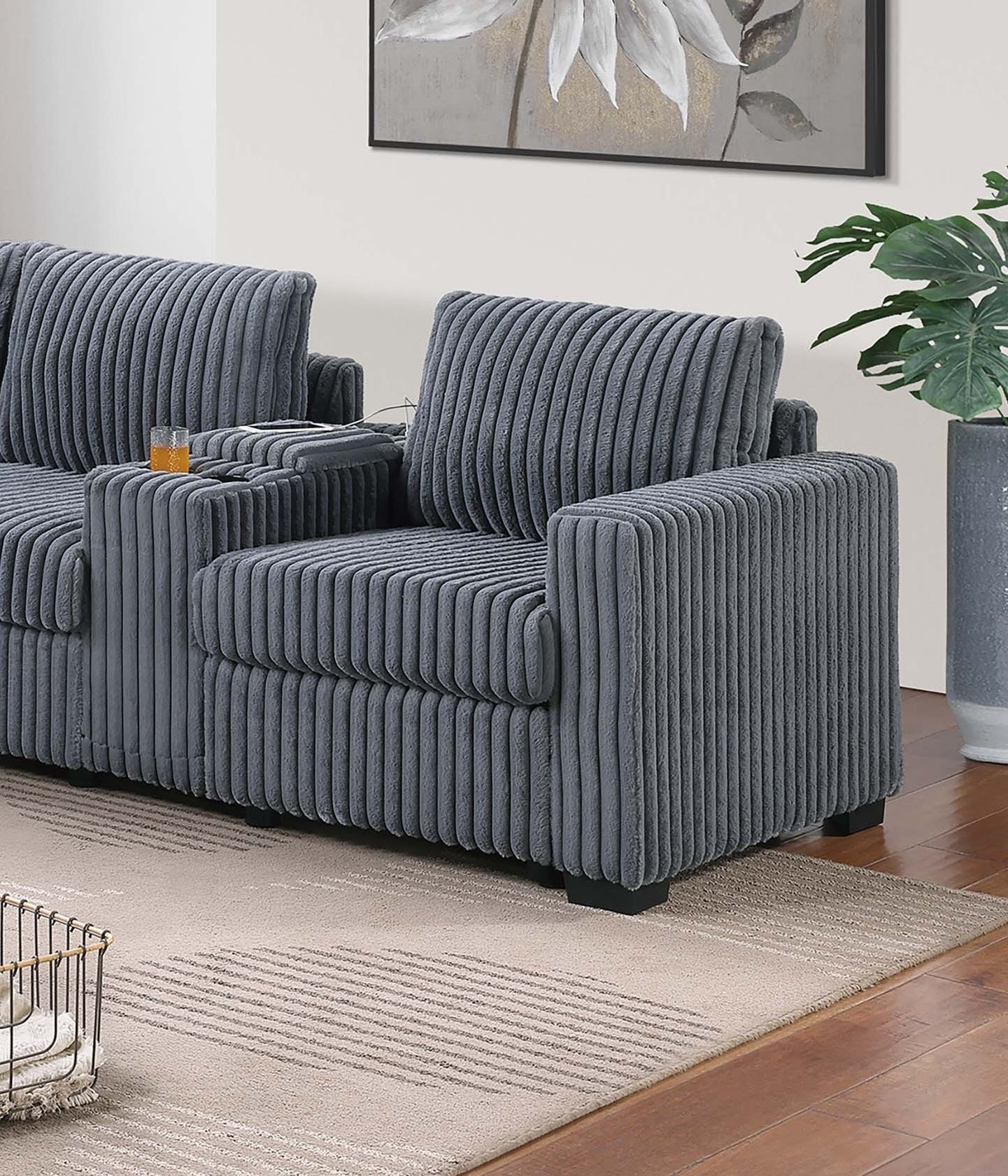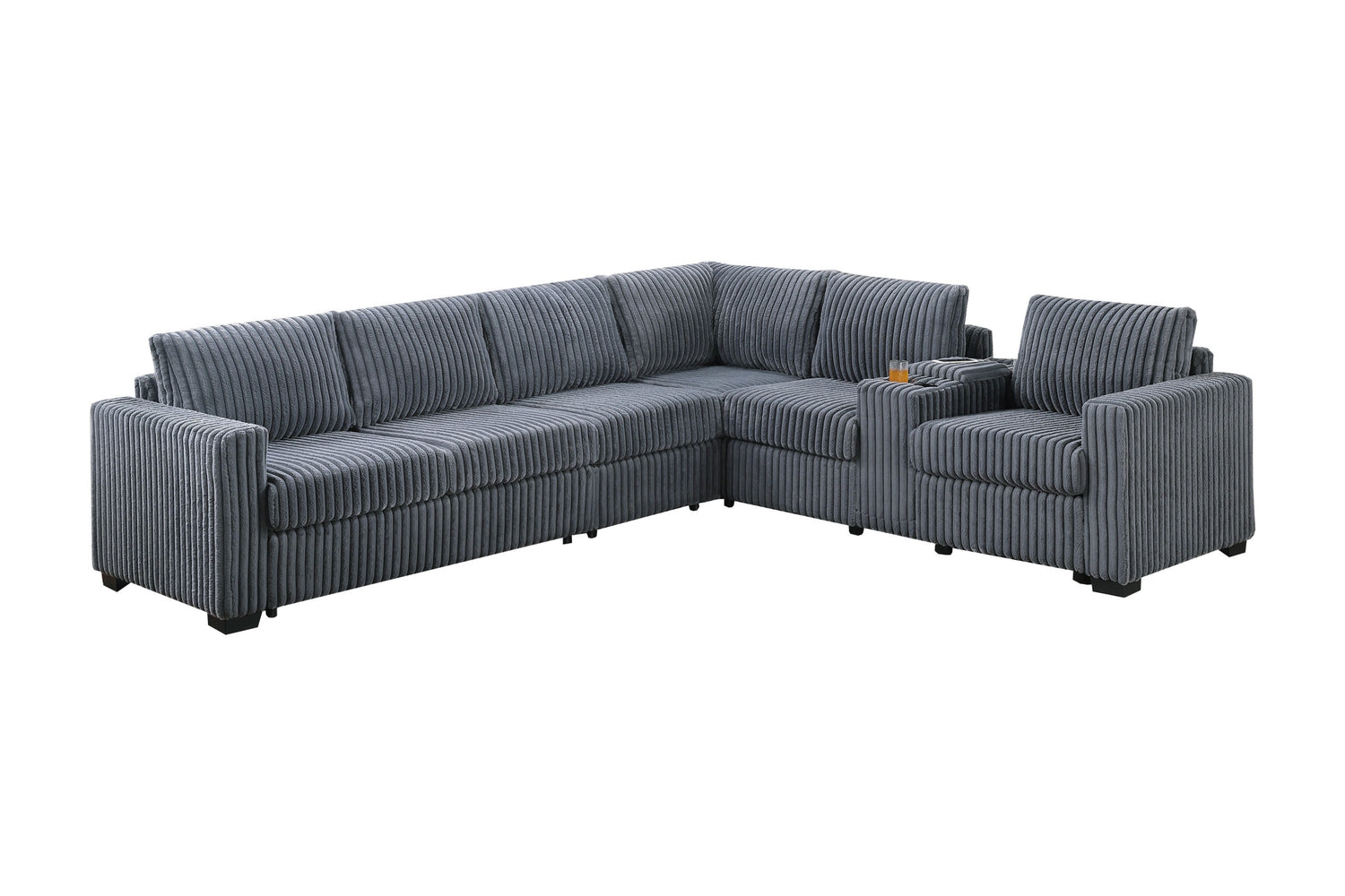 Elevate your living space with this thoughtfully designed 4-Piece Sectional Set, where comfort meets functionality in every detail. Wrapped in fur-like jumbo corduroy, the fabric invites you to sink in and unwind with its cozy texture and inviting presence. This sectional offers a versatile configuration, perfect for creating a layout that adapts to your space and your lifestyle. The set includes two reversible loveseats—one of which features a built-in console equipped with dual cup holders and a USB charging port, giving you a convenient space to power up your devices while keeping your favorite drink within arm’s reach. The console’s center storage compartment also provides a neat spot to tuck away remotes or other essentials, helping keep your lounge area organized. The corner wedge brings flow and continuity to the sectional’s shape, making it ideal for gathering around during movie nights or casual get-togethers. An armless chair is also included, offering added flexibility. Use it to extend the seating area or shift it to either side of the sectional to accommodate guests or adjust the overall shape of your seating arrangement. With a generous size this sectional comfortably seats multiple people without compromising personal space. The cushions are thoughtfully designed to offer supportive comfort for hours of relaxation, while the corded texture brings a touch of casual charm that blends well with modern or transitional interiors. Whether you're entertaining or stretching out for some downtime, this sectional invites you to make the most of your living room with its blend of functional features and inviting