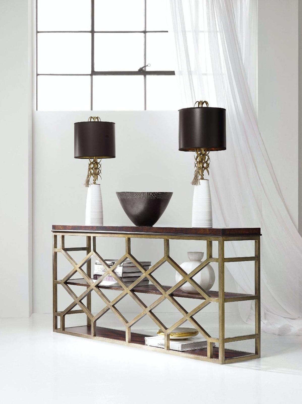Añada elegancia escultural y un toque artístico a su espacio con la consola Giles de la colección Melange de Hooker Furniture . Esta pieza de transición destaca por su lujoso tablero de madera de madroño dorado que irradia calidez y riqueza, combinado con una base de metal con intrincado diseño de rombos en un sofisticado acabado champán.