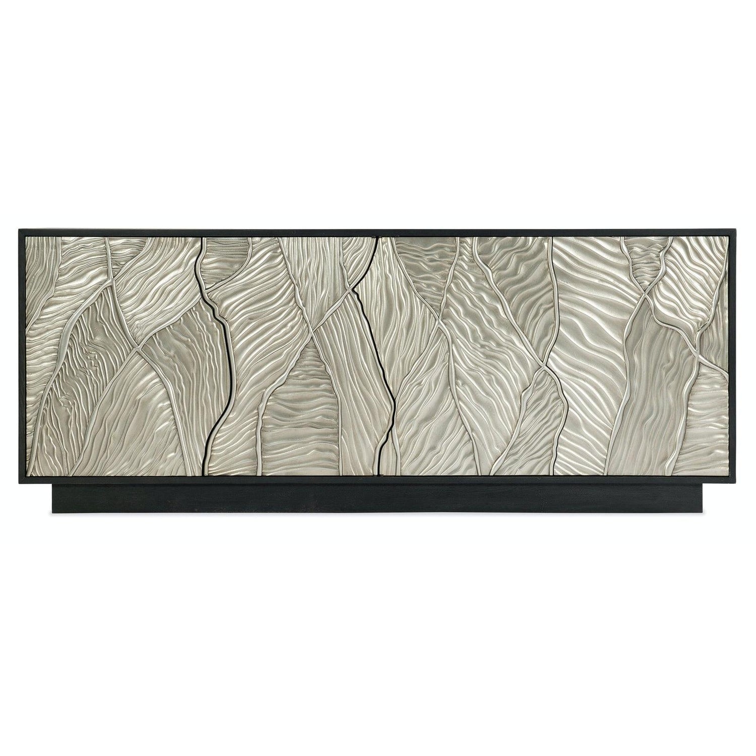 Realce su sistema de cine en casa con la consola de entretenimiento Melange Summit Gorge de Hooker Furniture . Esta pieza impactante combina chapas de roble negro con puertas frontales plateadas dimensionales para una impactante estética inspirada en Hollywood. Cuatro puertas con pestillo táctil se abren para revelar estantes ajustables, ventilación con preinstalación de cable y una fuente de alimentación integrada, lo que le da a su espacio multimedia un toque de estilo y funcionalidad. Diseñada para televisores de hasta 80 pulgadas, esta consola forma parte de la artística y ecléctica colección Melange .