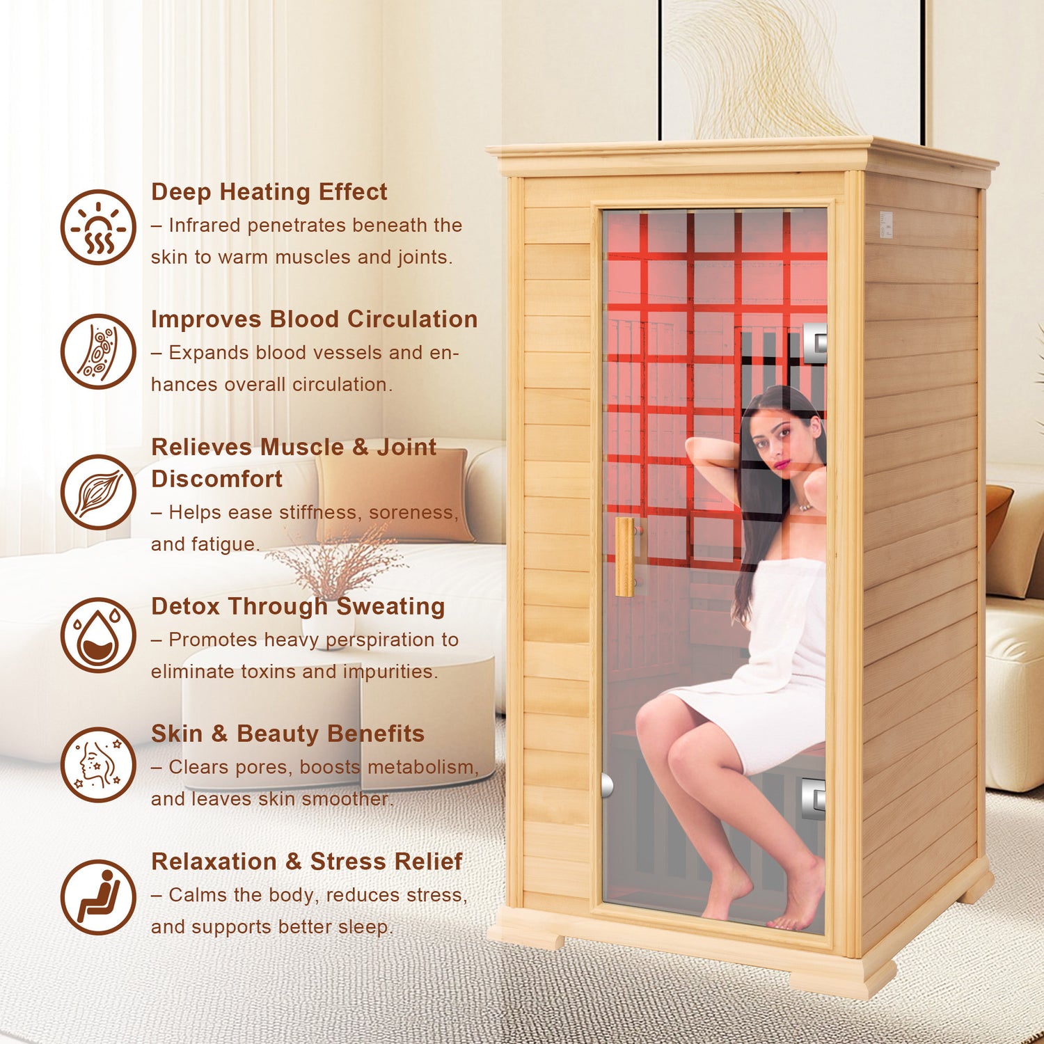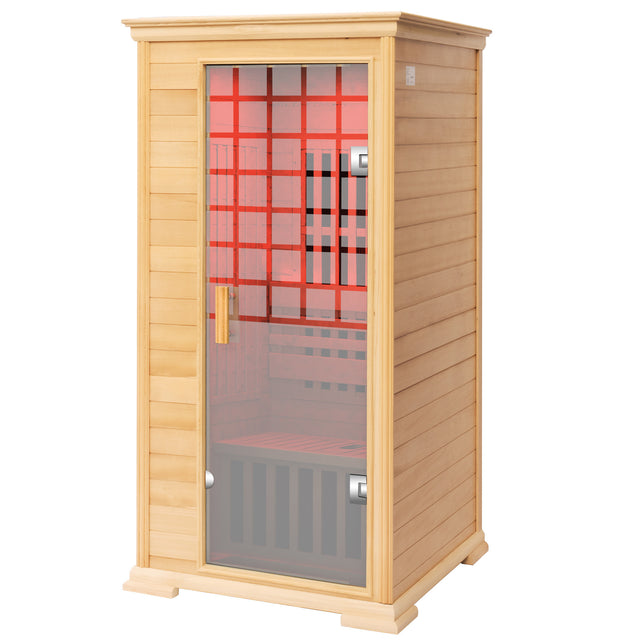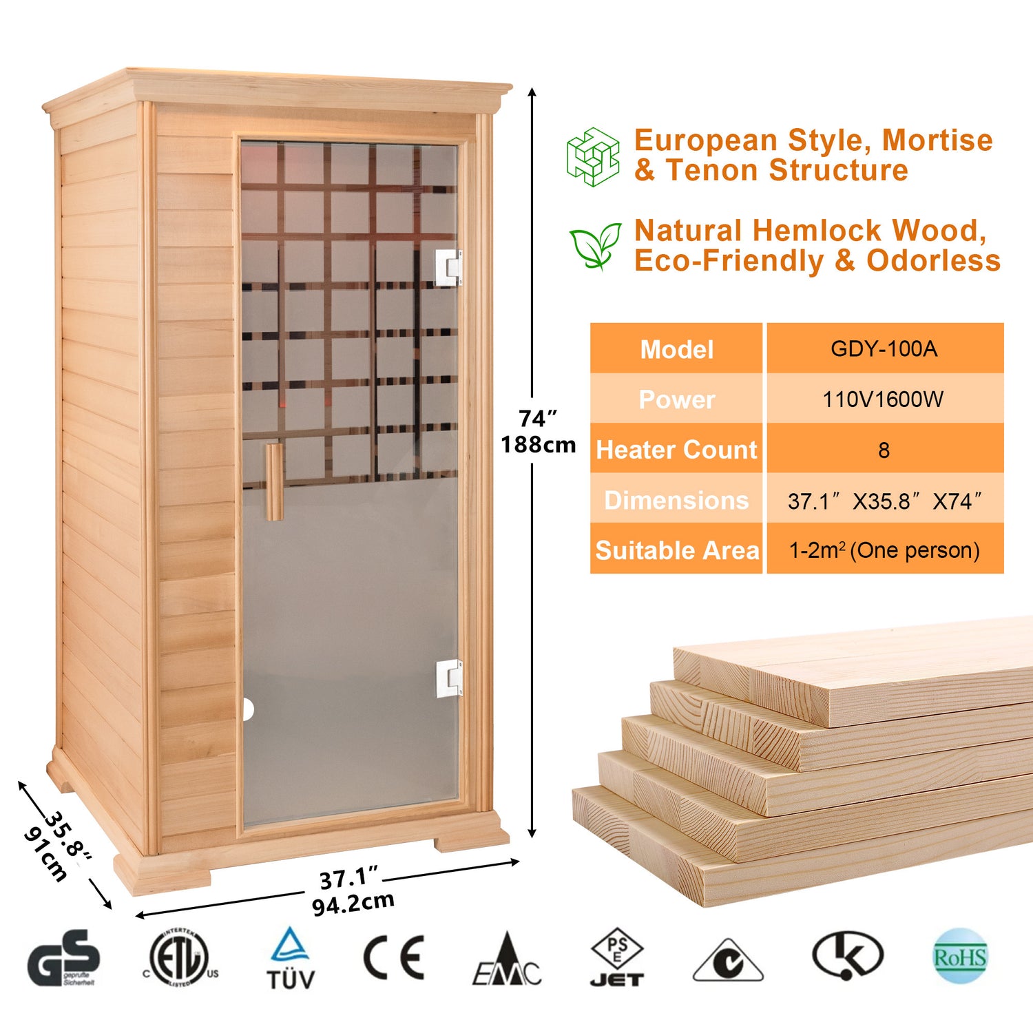 Sauna interior para una persona, 1600 W, madera de cicuta, puerta de cristal, luces LED rojas y Bluetooth. Tamaño: 94,5 x 90,9 x 198,8 cm.