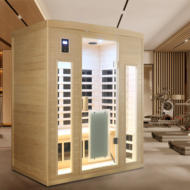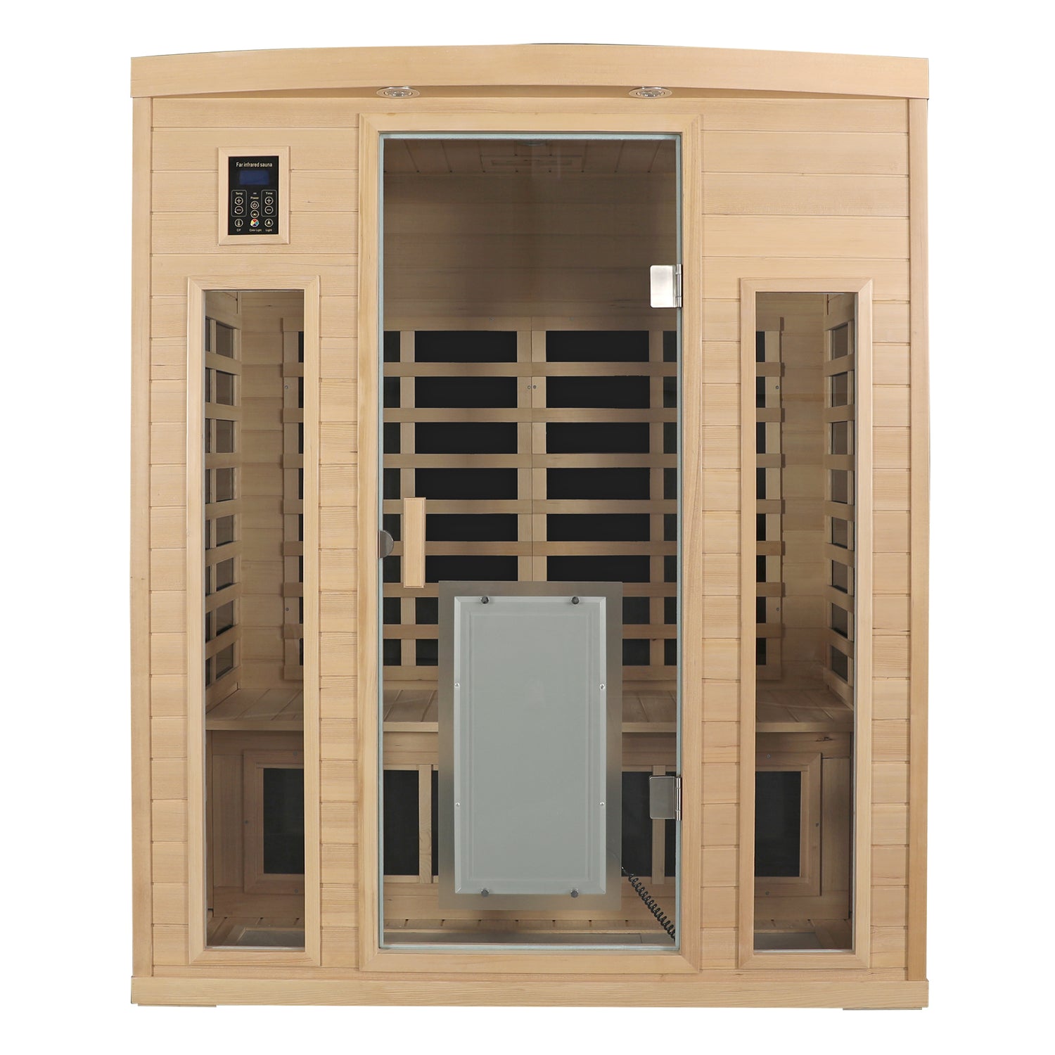 Bajo EMF, También hay una placa calefactora en la puerta de vidrio, Madera de cicuta, Sala de sauna interior de infrarrojos lejanos para tres personas - Por defecto está agotado y se enviará tan pronto como vuelva a estar disponible.