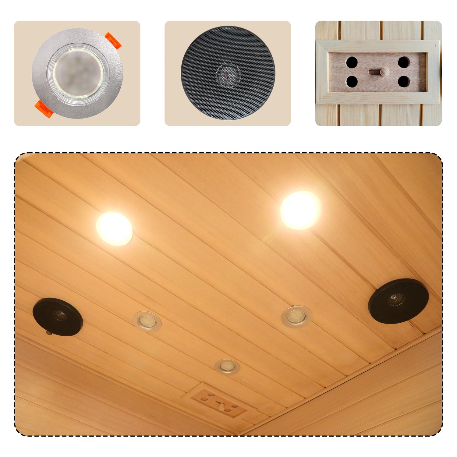 Sauna interior de esquina con infrarrojos lejanos, de Hemlock, para dos personas, con bajo EMF y panel calefactor en la puerta principal.