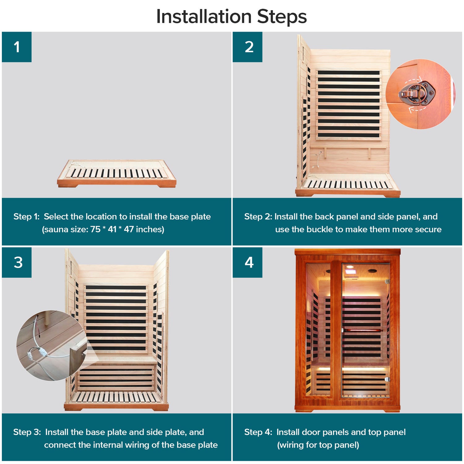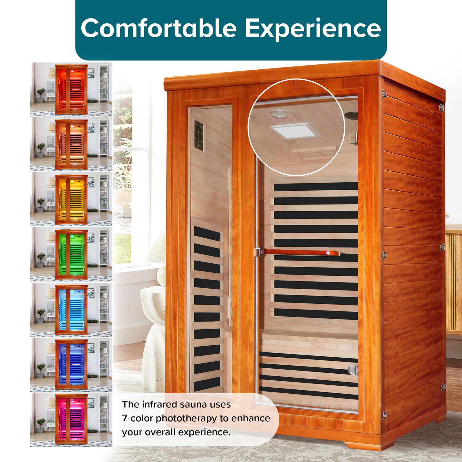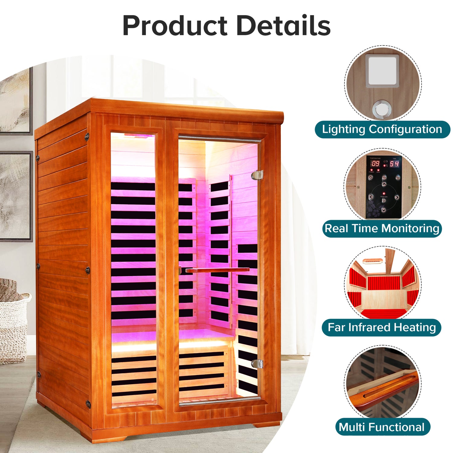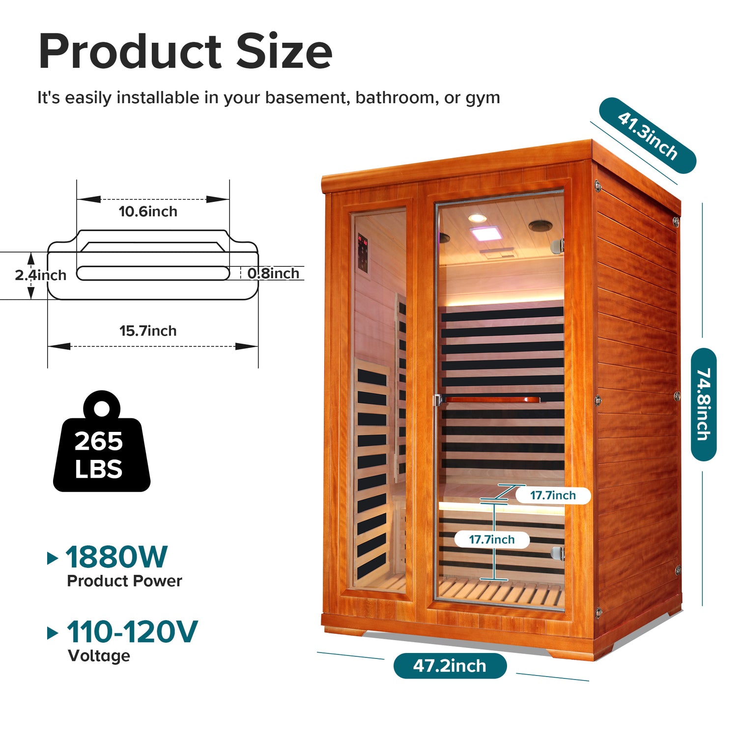 Tamaño del producto: 120 cm x 105 cm x 190 cm Potencia: 1880w Número de placas calefactoras: 7 piezas Material de calentamiento: Placa calefactora Spectrum Temperatura normal de funcionamiento (Celsius): 10 ° C - 40 ° C Rango de temperatura de funcionamiento (Celsius): 25 ° C-60 ° C Material del tablero de madera: Aoguman Lámpara: Lámpara redonda + Lámpara de color cuadrada Longitud del cable de alimentación: 3 metros Capacidad de carga del asiento: 100 kilogramos Tamaño del asiento 45cm * 110cm Dimensiones del espacio interior: 110 cm * 94 cm * 177 cm Tamaño de la puerta: 55 cm * 57 cm Especificaciones del embalaje: A: 183 cm * 100 cm * 21 cm B: 183 cm * 126 cm * 23 cm C: 126 cm * 113 cm * 32 cm