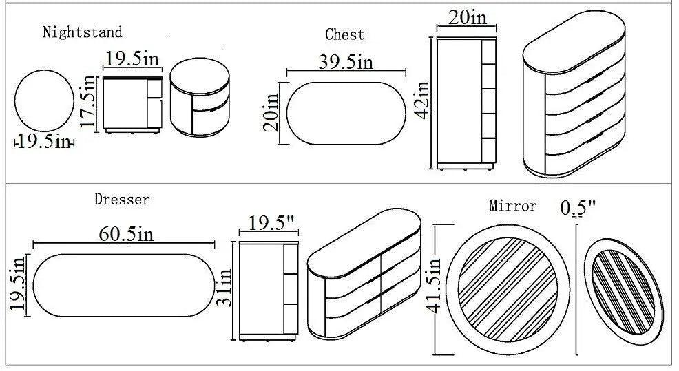 - Mesitas de noche: 19,5" de largo x 19,5" x 17,5" de alto