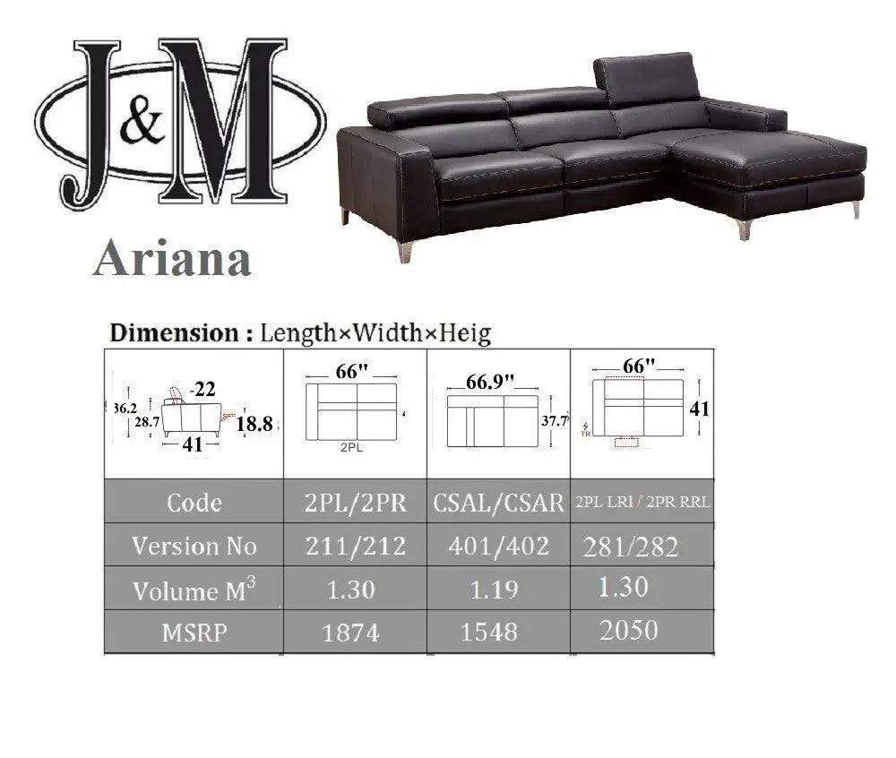 J&M se enorgullece de presentar nuestra nueva incorporación a nuestros sofás seccionales de cuero premium: el sofá seccional Ariana de cuero premium. Magníficamente tapizado en cuero italiano grueso de primera calidad, este sofá seccional cuenta con tres reposacabezas ajustables que sin duda le impresionarán. El sofá seccional Ariana también cuenta con un sillón reclinable eléctrico para maximizar la comodidad, a la vez que luce un estilo moderno que sin duda le impresionará.