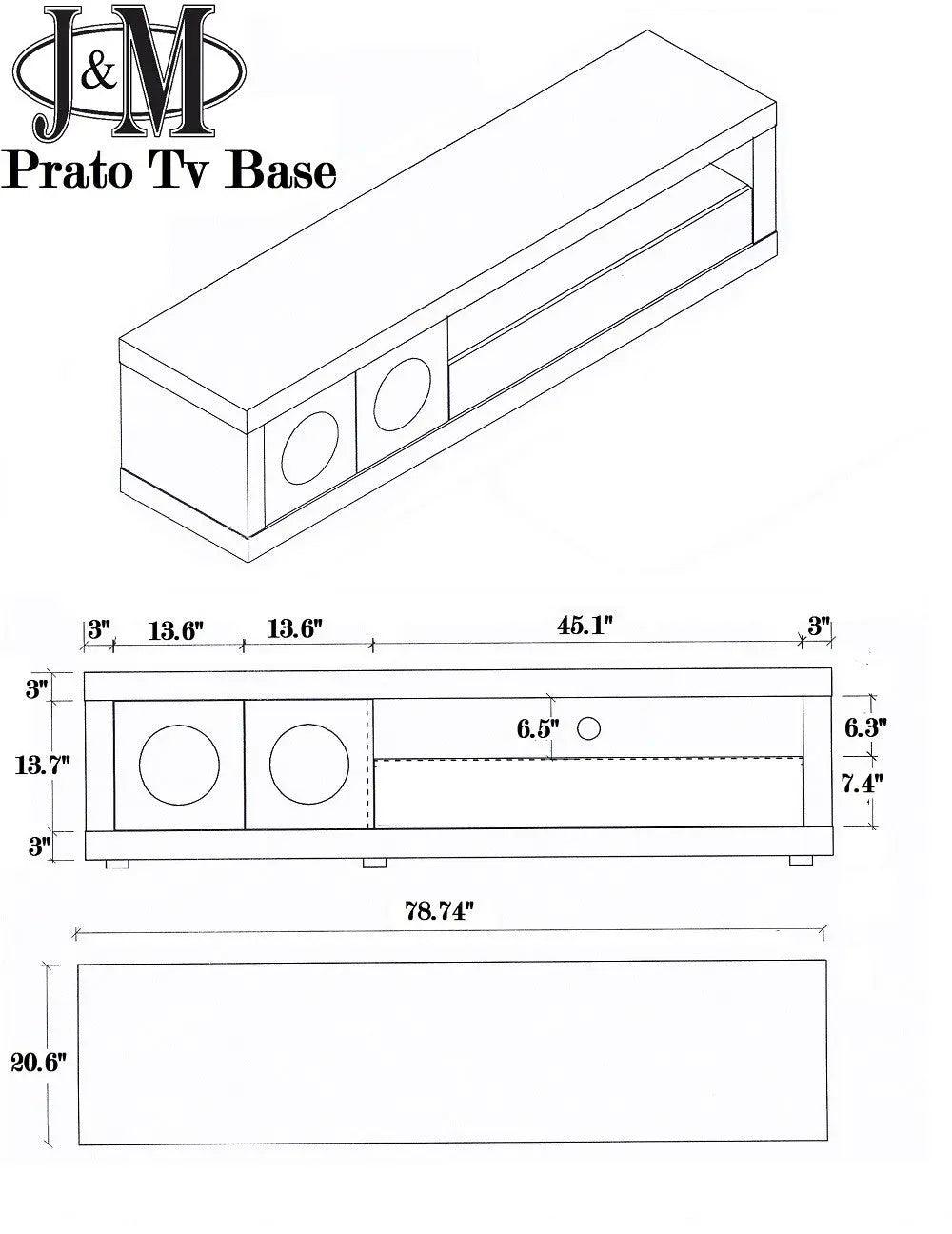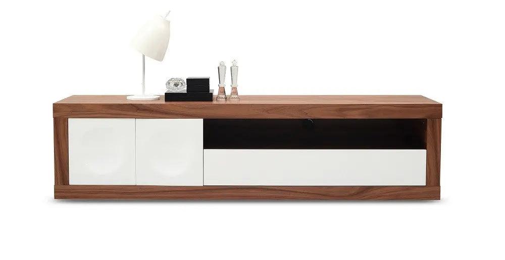 La base de TV moderna Prato presenta una hermosa combinación de chapa de nogal y blanco brillante. Esta base cuenta con un estante con orificios precortados para facilitar la gestión de cables de los dispositivos multimedia, así como cajones de cierre suave para almacenamiento.