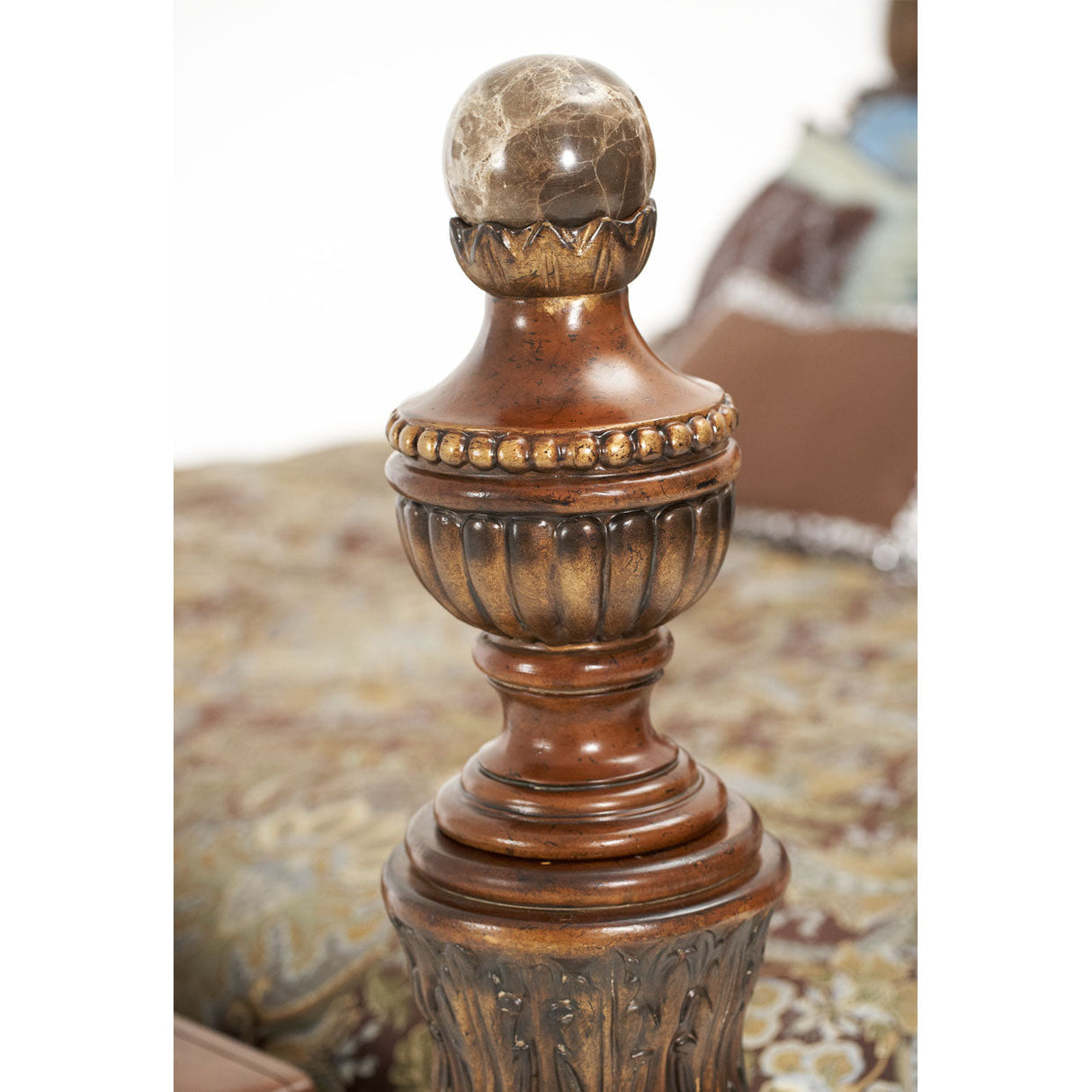 - Cama con dosel bajo tallado y remates de mármol para un gran acento arquitectónico.
