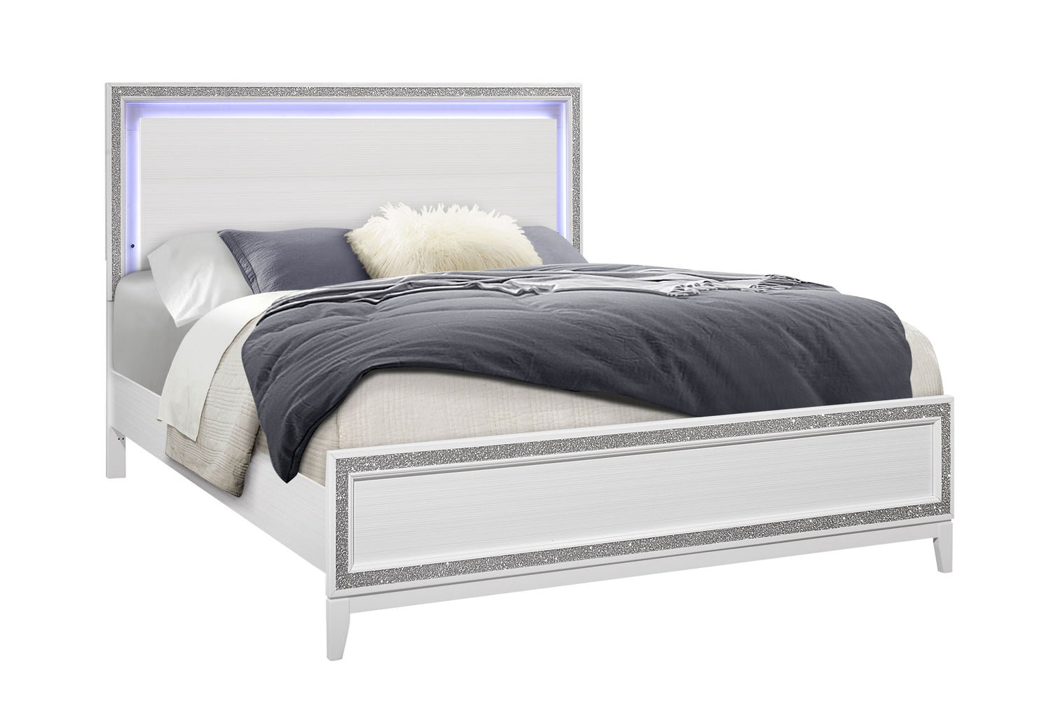 El dormitorio Lily fusiona dos mundos. Las líneas clásicas y los toques modernos crean un hermoso y glamuroso dormitorio de transición. El diseño de cristal triturado realza todas las piezas, junto con la iluminación LED que realza el cabecero. Este diseño no solo se utiliza como moldura decorativa, sino que también se extiende a los herrajes. El resultado final es un hermoso y glamuroso dormitorio.