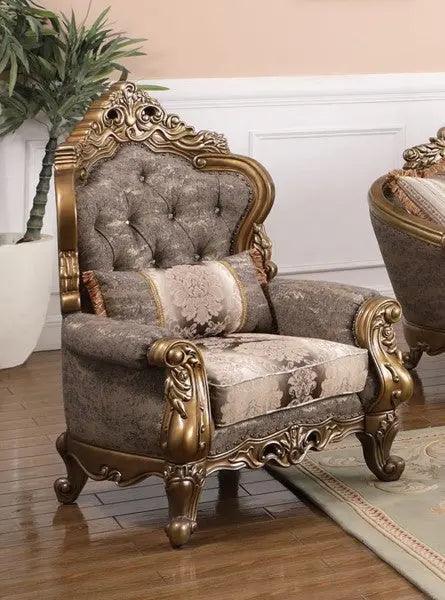 Juego de sala Amelia de Cosmos Furniture, de estilo tradicional, en madera con acabado bronce. El sofá Amelia es precioso, con una tapicería de tela brillante que realza el acabado dorado antiguo de la estructura de madera. Los respaldos capitoné se extienden bajo arcos tallados. Los cojines sueltos del asiento están tapizados en una tela con estampado floral que se extiende sobre los brazos enrollados. Un motivo floral adorna cada pieza de esta adición a nuestra exclusiva colección de diseño. Las patas Queen Anne complementan el conjunto para iluminar su sala de estar. Se incluyen cojines decorativos. La mesa de centro Amelia es preciosa con una cubierta de mármol natural enclavada en una estructura de madera que realza el acabado dorado antiguo de esta mesa de centro. La mesa tiene un borde en relieve que acentúa los motivos florales con un acabado vintage cepillado a mano. Un motivo floral adorna cada pieza de esta adición a nuestra exclusiva colección de diseño. Las patas Queen Anne complementan el conjunto para iluminar su sala de estar.