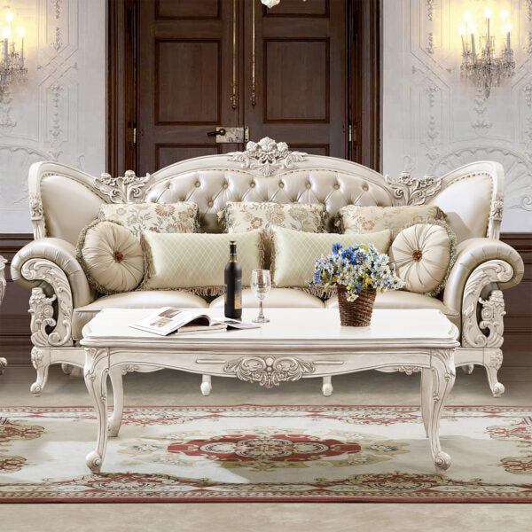 Consiga un estilo majestuoso y verdaderamente decadente en su hogar con los impresionantes diseños europeos de esta colección tradicional. Esta colección ofrece una variedad de exquisitas características, como brazos de madera curvada, cuero bifundido sobre brazos robustos laminados, 100 % secado al horno, estructura de madera maciza para máxima resistencia, 100 % madera maciza decorativa tallada a mano, cojines con flecos y detalles de cuero, y tallado detallado en los brazos y la base.