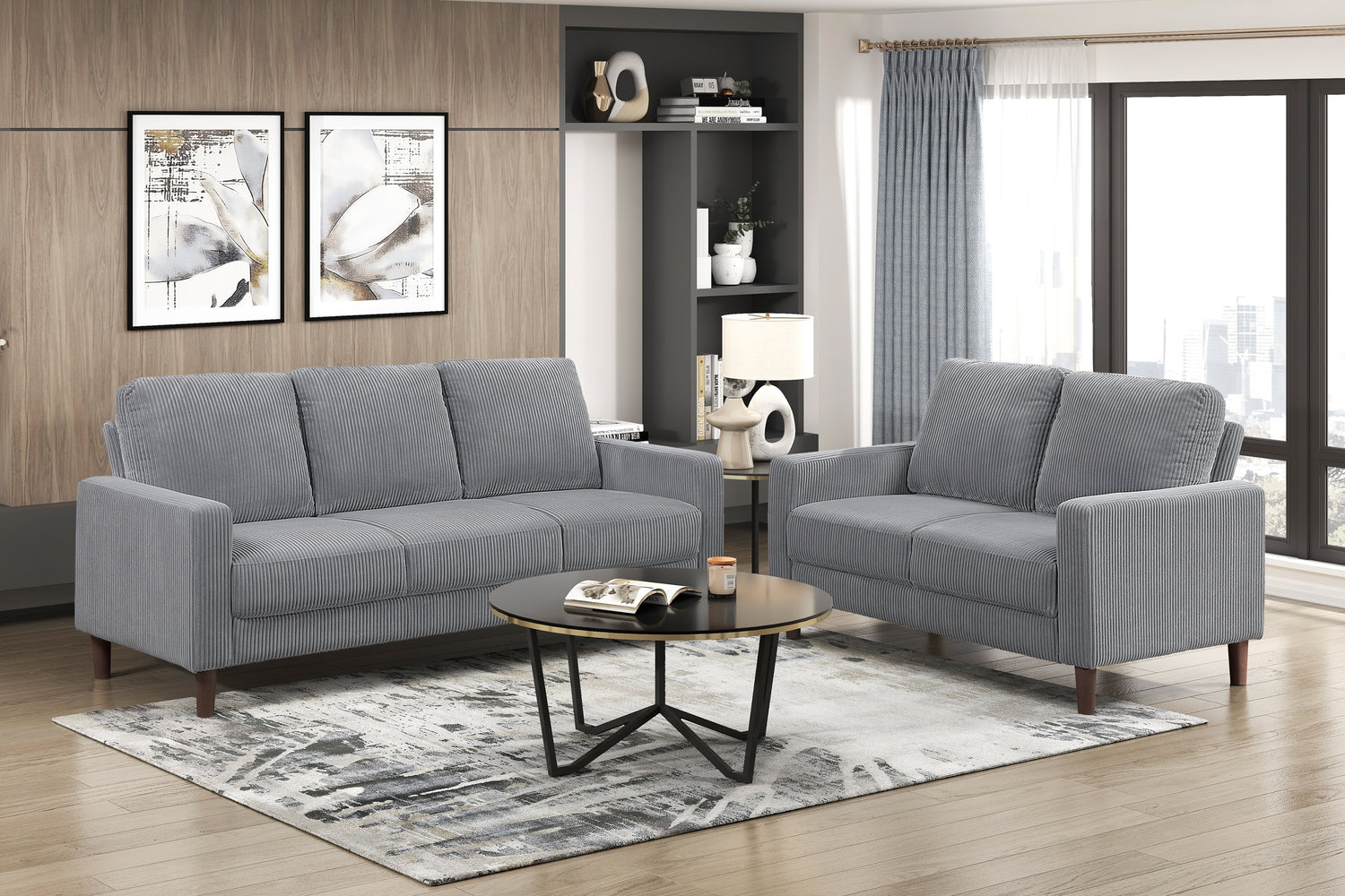 Add a touch of cozy elegance to your living space with this Track Arm Loveseat. This stylish 2-seater sofa features a soft, textured gray corduroy upholstery, bringing warmth and inviting comfort to any room. The clean, modern silhouette is complemented by sturdy brown faux wood finish legs, providing a touch of natural sophistication. The generously cushioned seats and back offer exceptional comfort, making this loveseat perfect for relaxing, entertaining, or simply enjoying quality time. This versatile piece seamlessly complements a variety of décor styles, making it an ideal addition to your living room, apartment, or small space. PRODUCT DIMENSIONS: Overall Dimension: 54.5' x 34' x 36.5'H Seat Width: 44.25' Seat Depth: 21' Seat Height: 19.25' Arm width: 5' Arm height: 31.5' Doorway width: 25.5 Listing Includes: - One Loveseat Only. Simple Assembly Require