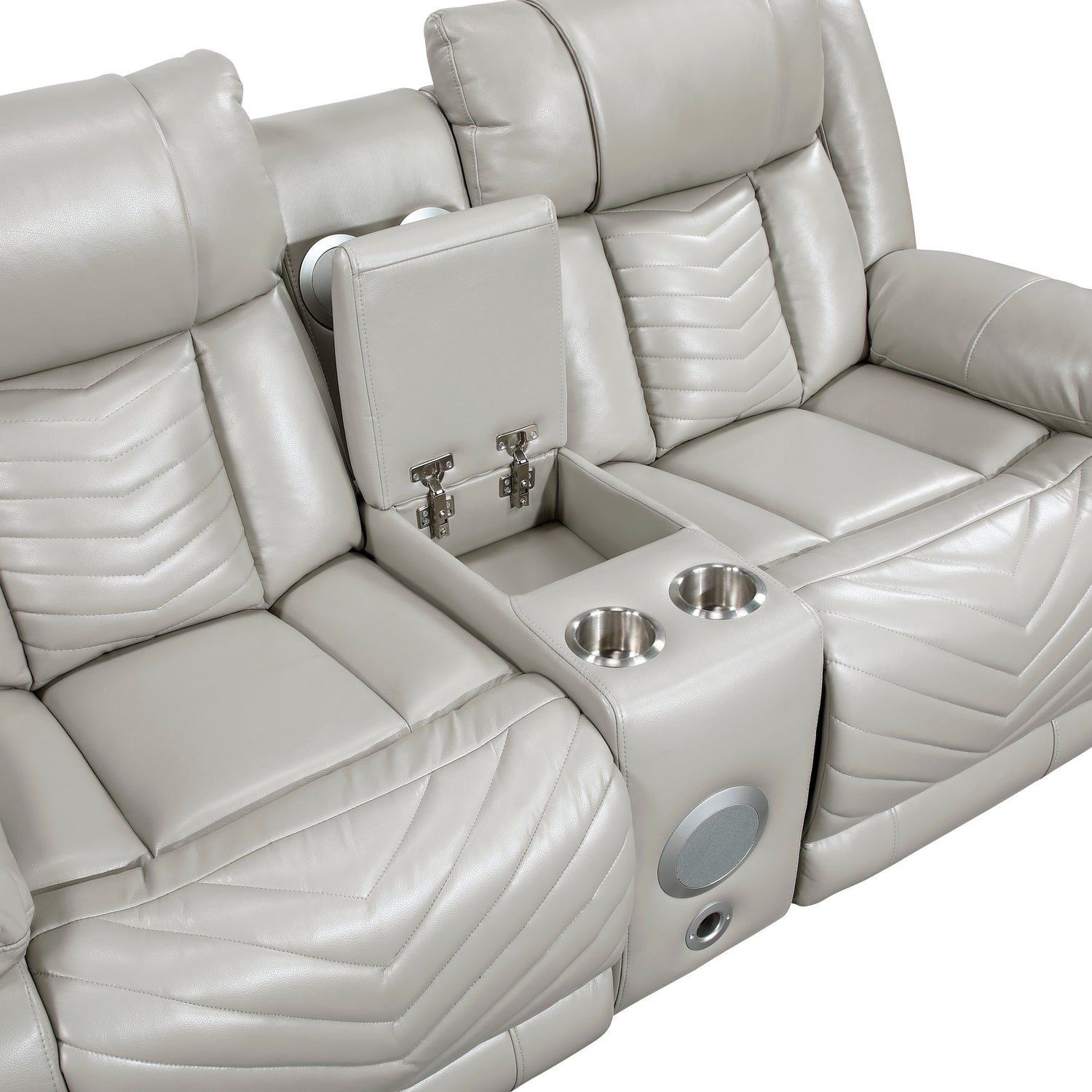 El sofá de dos plazas reclinable eléctrico Homelegance Huron en gris (SKU: 8457GRY-2PW) mide 198 × 94 × 101 cm y ofrece dos sillones reclinables eléctricos de un solo toque, altavoces inalámbricos, carga USB, iluminación LED en la base y una consola central con portavasos y espacio de almacenamiento oculto. Tapizado en piel sintética gris de primera calidad con costuras en V, este sofá reclinable ofrece comodidad, tecnología y durabilidad para relajarse en compañía.