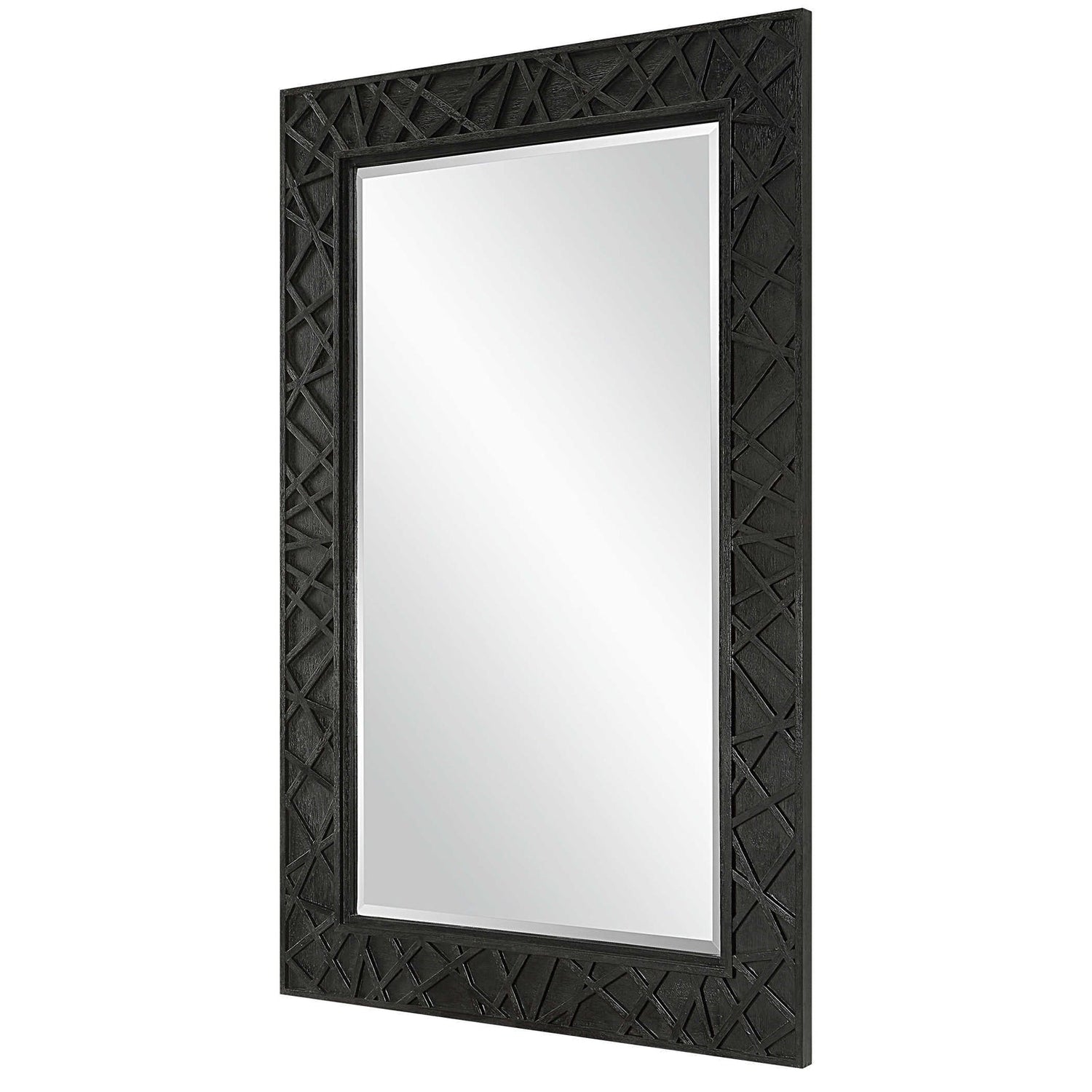 - Seguro que dejará huella en cualquier espacio, este espejo de gran tamaño tiene un marco de madera con detalles geométricos en relieve y acabado en negro satinado.