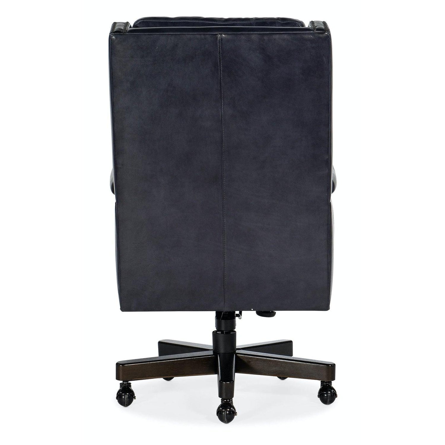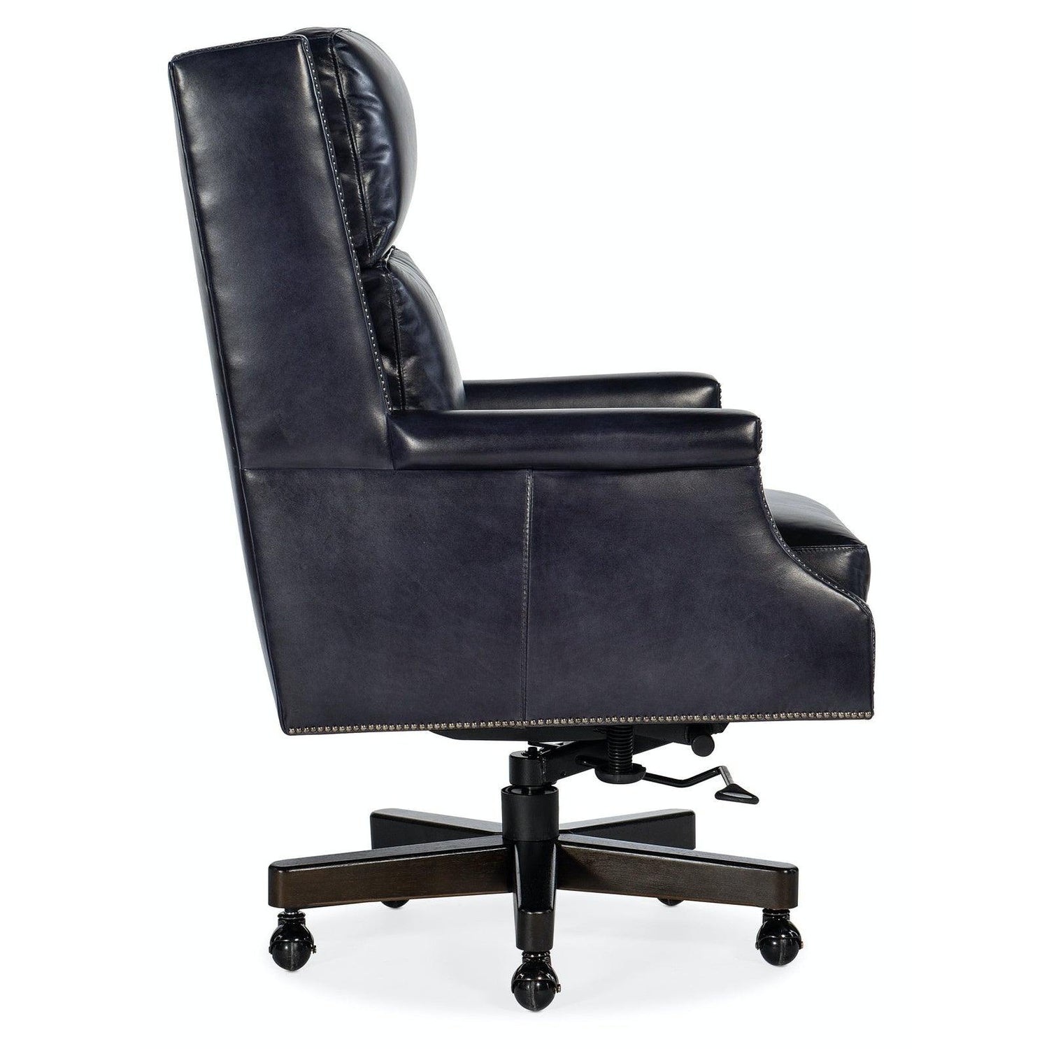 La silla ejecutiva giratoria e inclinable Beckett de Hooker Furniture, en cuero de grano superior anilina azul Checkmate Champion , combina la elegancia tradicional con la comodidad moderna. Con un respaldo estilo polisón, ribete de tachuelas plateadas y un asiento amplio y acolchado, esta silla ejecutiva ofrece una silueta atemporal y funcionalidad para el día a día.