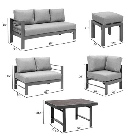 - Dimensiones del producto: Sofá de esquina individual x 1: 26 pulgadas × 26 pulgadas × 9,84 pulgadas, Sofá de esquina doble x 1: 47,24 pulgadas × 26 pulgadas × 25,6 pulgadas, Sofá de tres esquinas x 1: 69,30 pulgadas × 26 pulgadas × 25,6 pulgadas, Mesa de bar alta x 1: 51,18 pulgadas × 33,86 pulgadas × 26,38 pulgadas, pedal x 2: 15 pulgadas × 15 pulgadas × 12 pulgadas