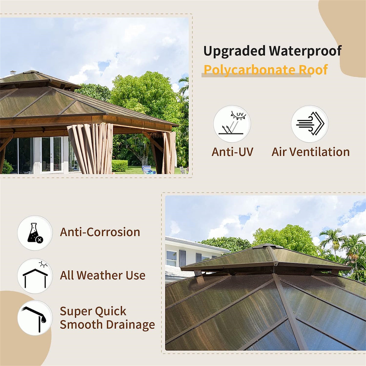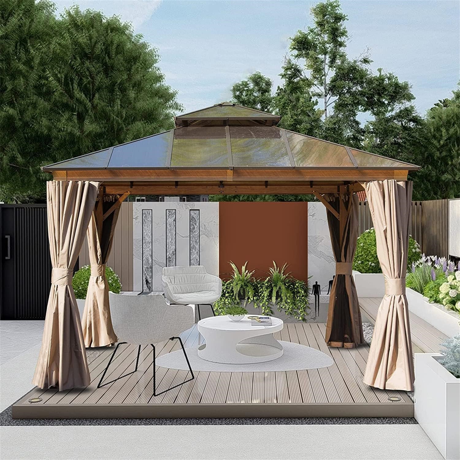 Gazebo de techo rígido de 3,6 x 3,6 m, para exteriores, permanente, con techo doble de policarbonato, de aluminio, con cortina y red para jardín, patio, césped, terraza y patio trasero (con aspecto de madera).