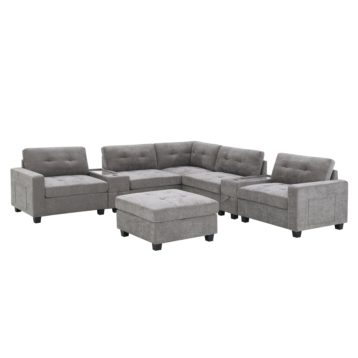 Modern Chenille U-Shaped Sectional Sofa with Acrylic Table Top, USB Charger, Storage Drawers, and Movable Ottoman in Gray