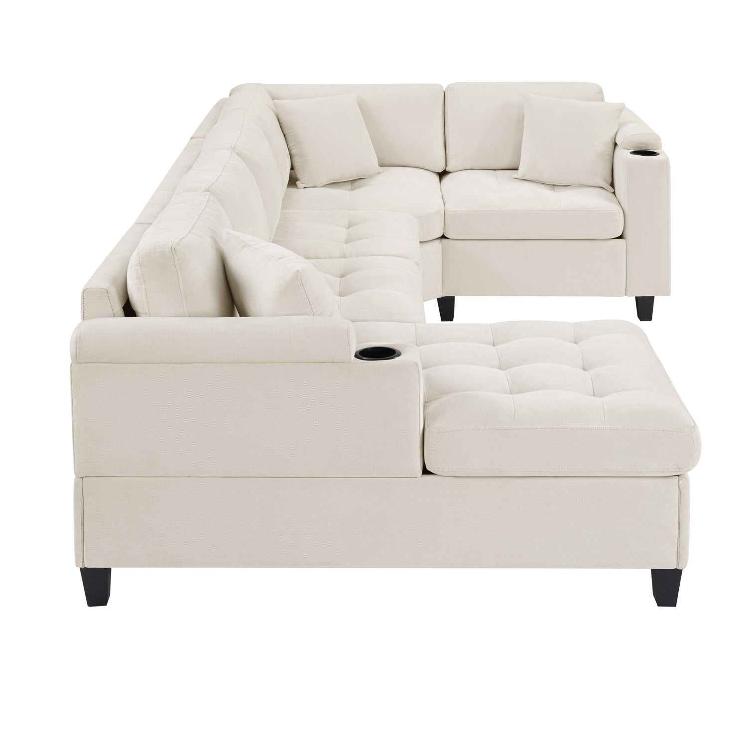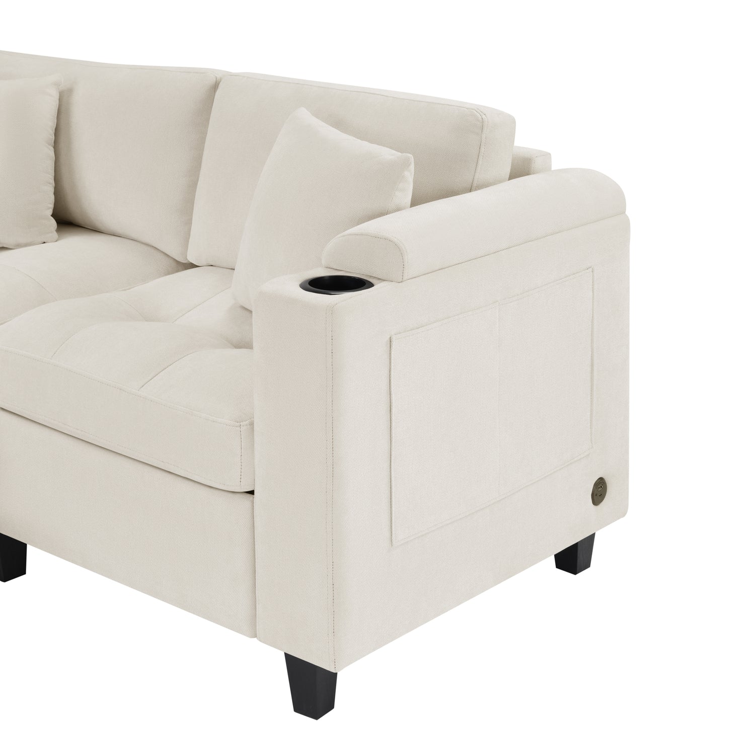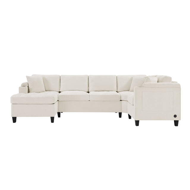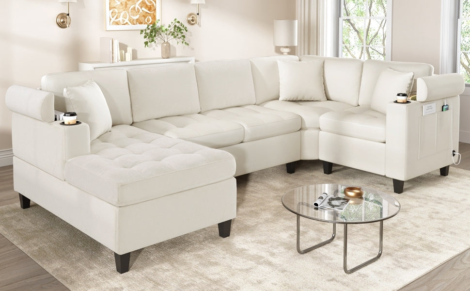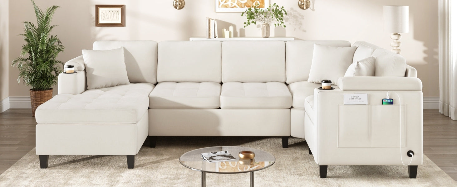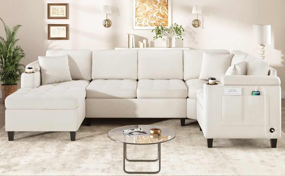 Modern U-shaped Sectional Sofa 115.7' with Built-in Cup Holders, Storage, USB Ports in Beige Chenille Fabric