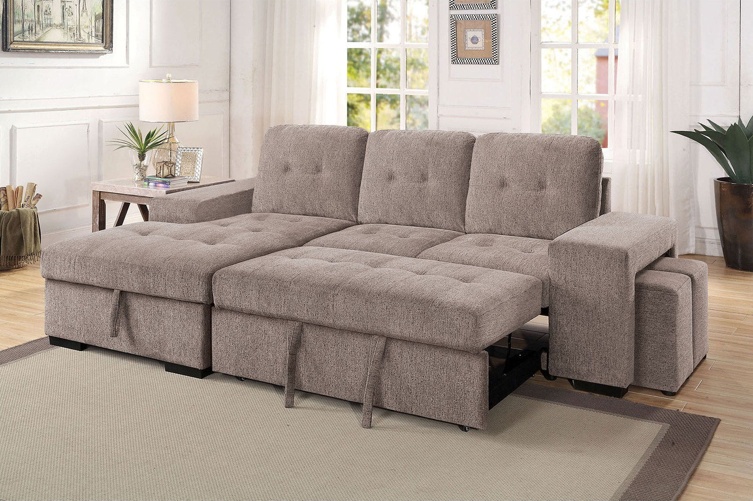 Características únicas personalizan este seccional. Dos otomanas extraíbles se guardan discretamente en un amplio reposabrazos, hay espacio de almacenamiento oculto bajo el amplio reposapiernas, y lo mejor de todo es el sofá cama extraíble oculto. ¡Qué multifuncional!