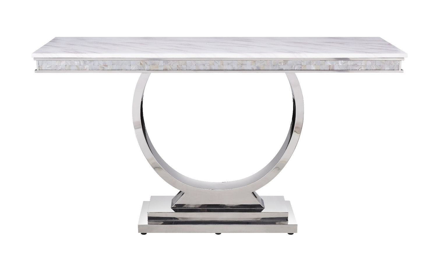 Mesa de sofá Acme - Zander 87359 con superficie de imitación mármol blanca y acabado plateado espejado.