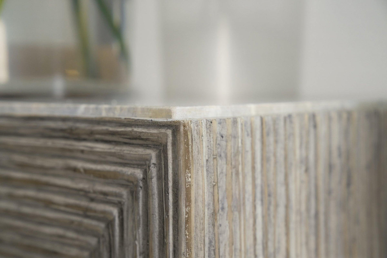 - Brie: un tono grisáceo con detalles orgánicos de caña. Encimera de mármol crema.